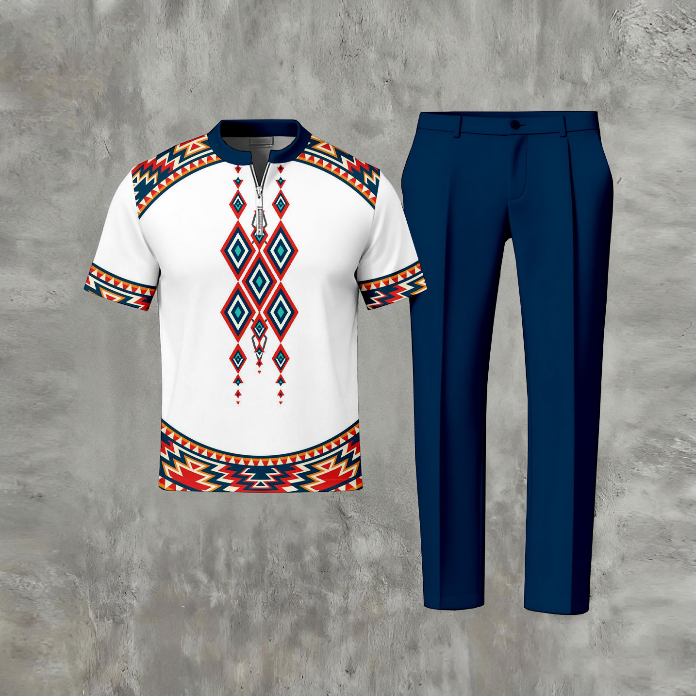Men's Casual Royal Blue & White Color Matching Multi Ethnic Pattern Round Neck Zipper Short Sleeved T-Shirt & Trousers Two-Piece Set
