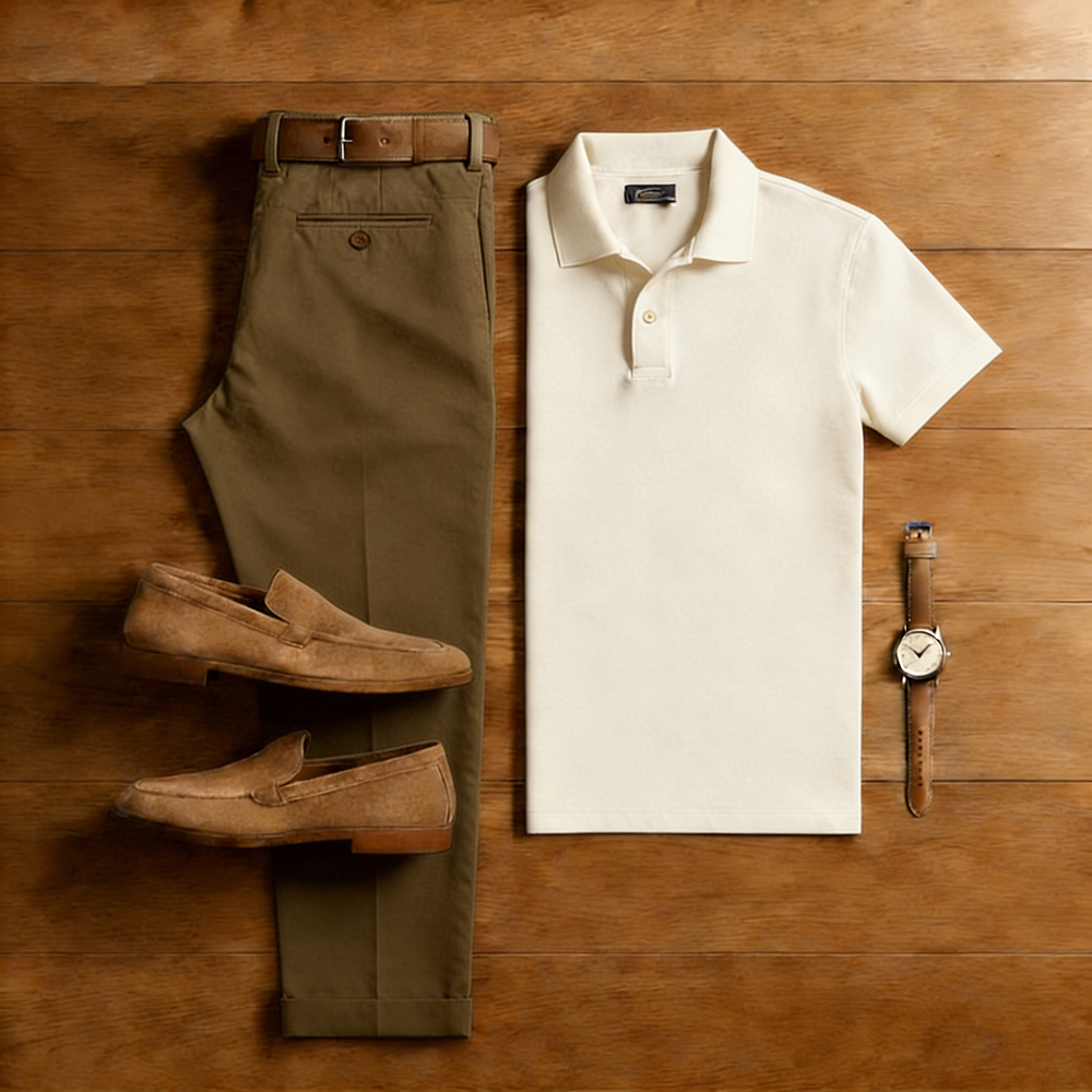 Men's Casual Army Green & Apricot Solid Color Matching Short-Sleeve Polo Shirt & Trousers Two-Piece Set