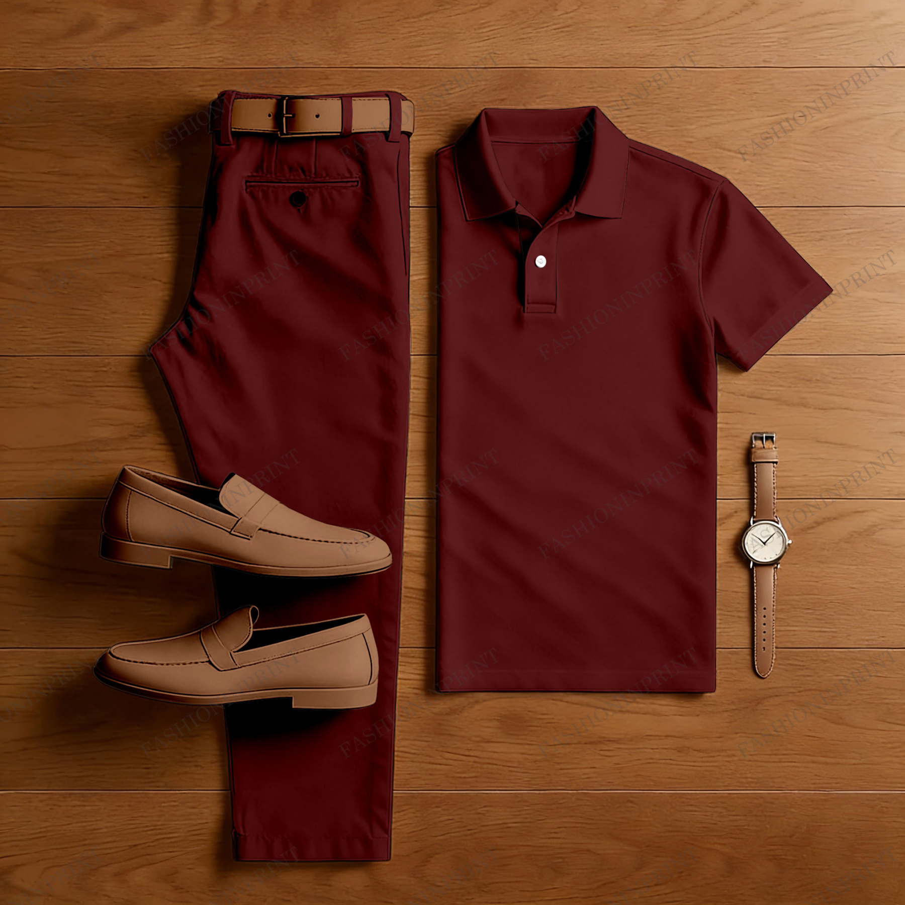 Men's Casual Burgundy Short Sleeved Polo Shirt & Trousers Two-Piece Set