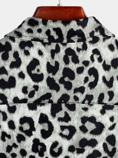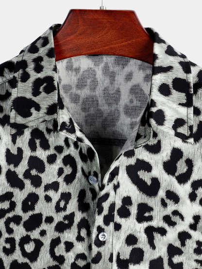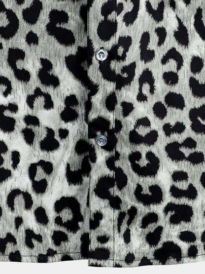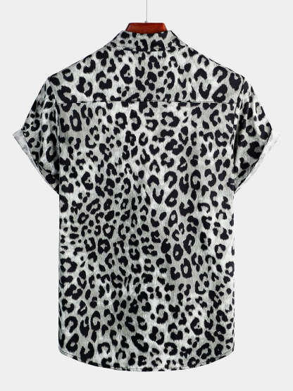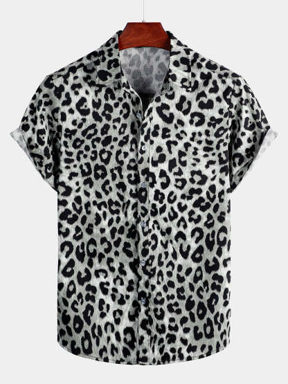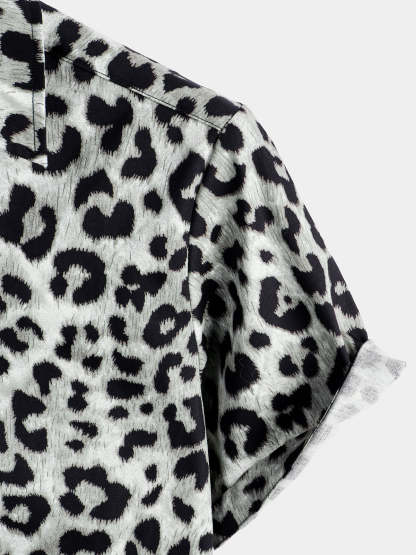 Men's Cotton Casual White Leopard Animal Print Cheetah Rock Button Up Short Sleeve Shirt