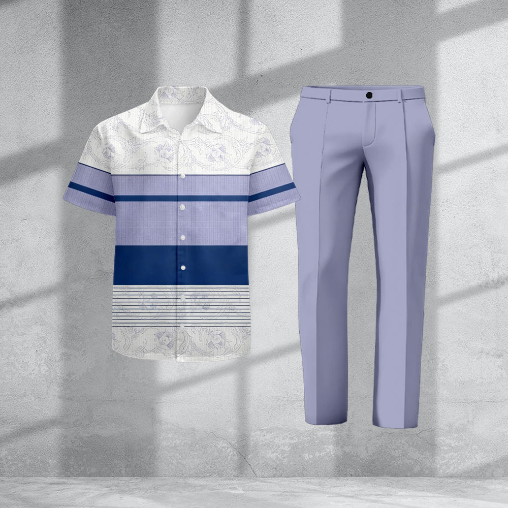 Men's Casual White & Purple Color Matching Print Short-Sleeve Shirt & Trousers Two-Piece Set