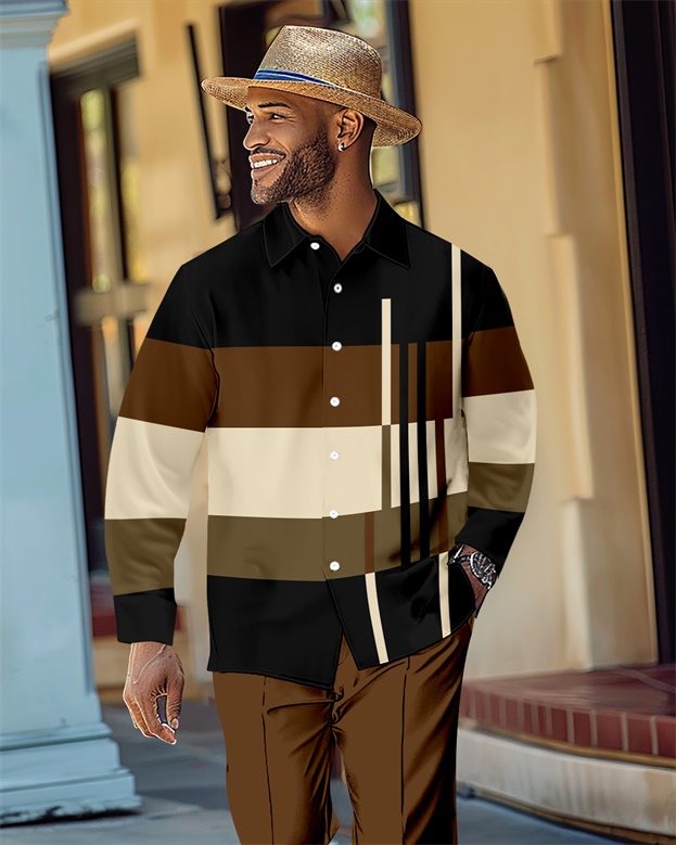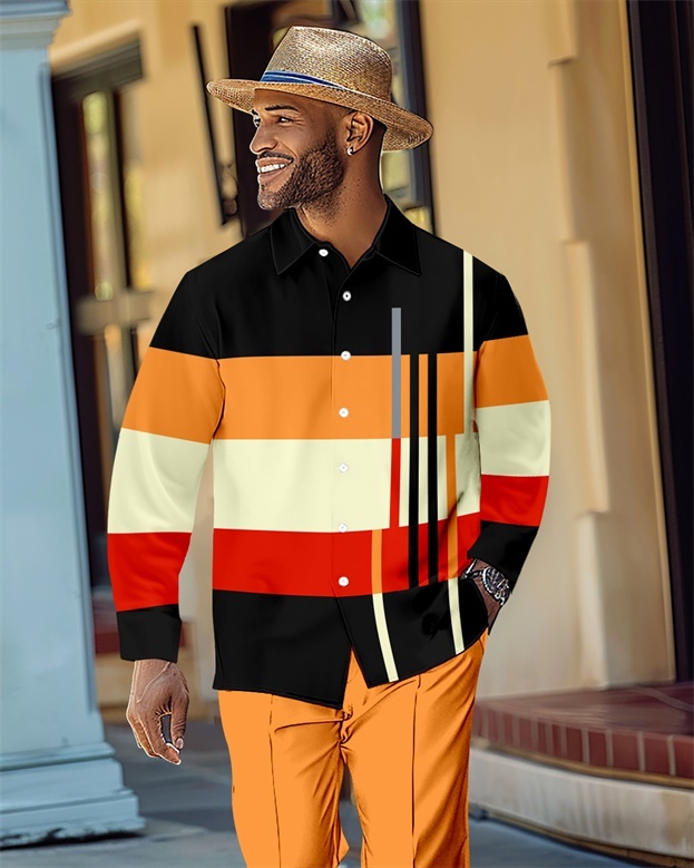 Men's Colorblock Printed Long Sleeve Shirt Casual Walking Suit 466