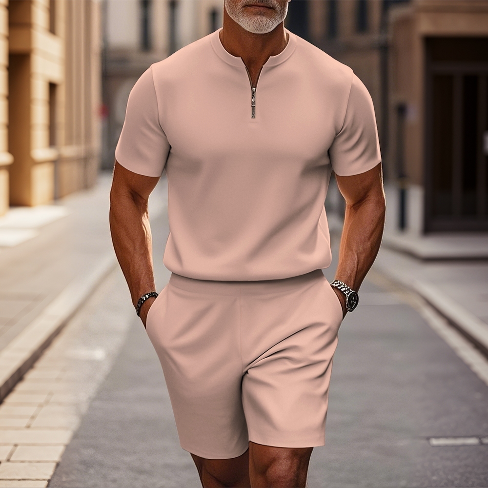 Men's fashion casual round-neck zipper geometric printed short-sleeved two-piece set