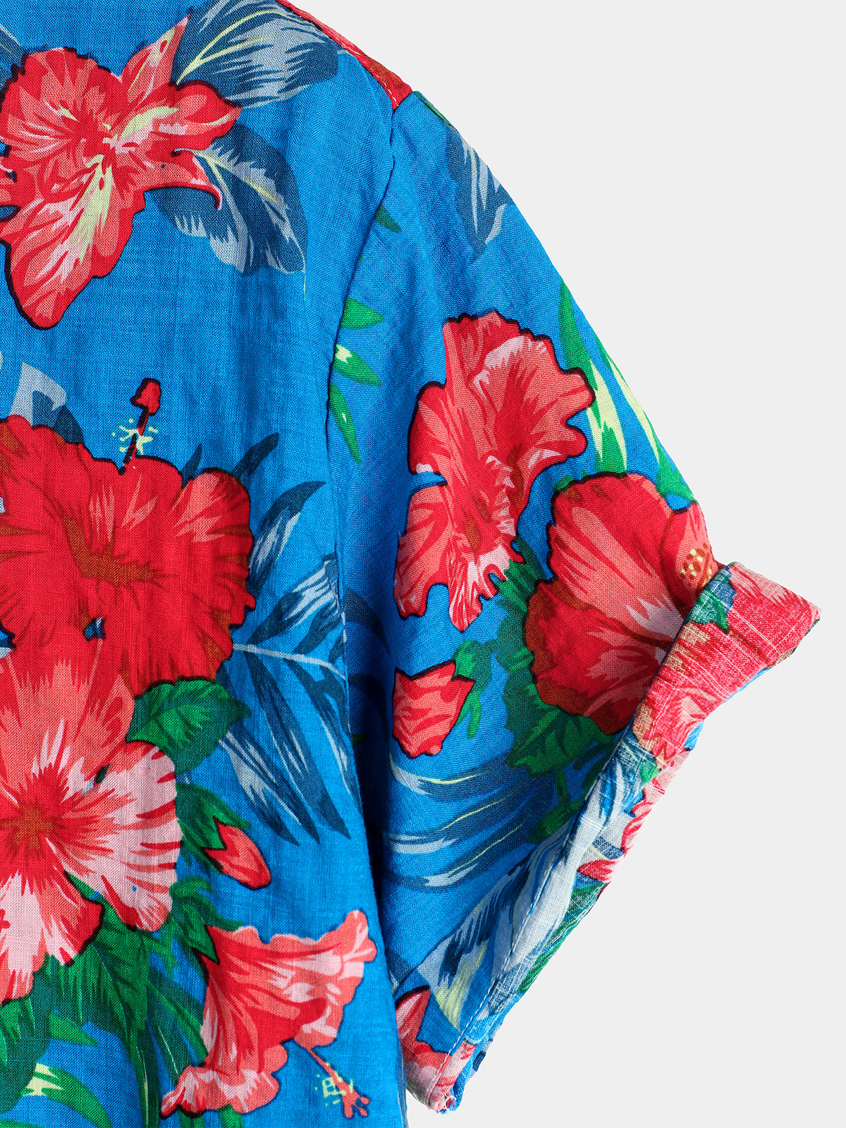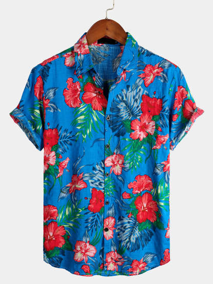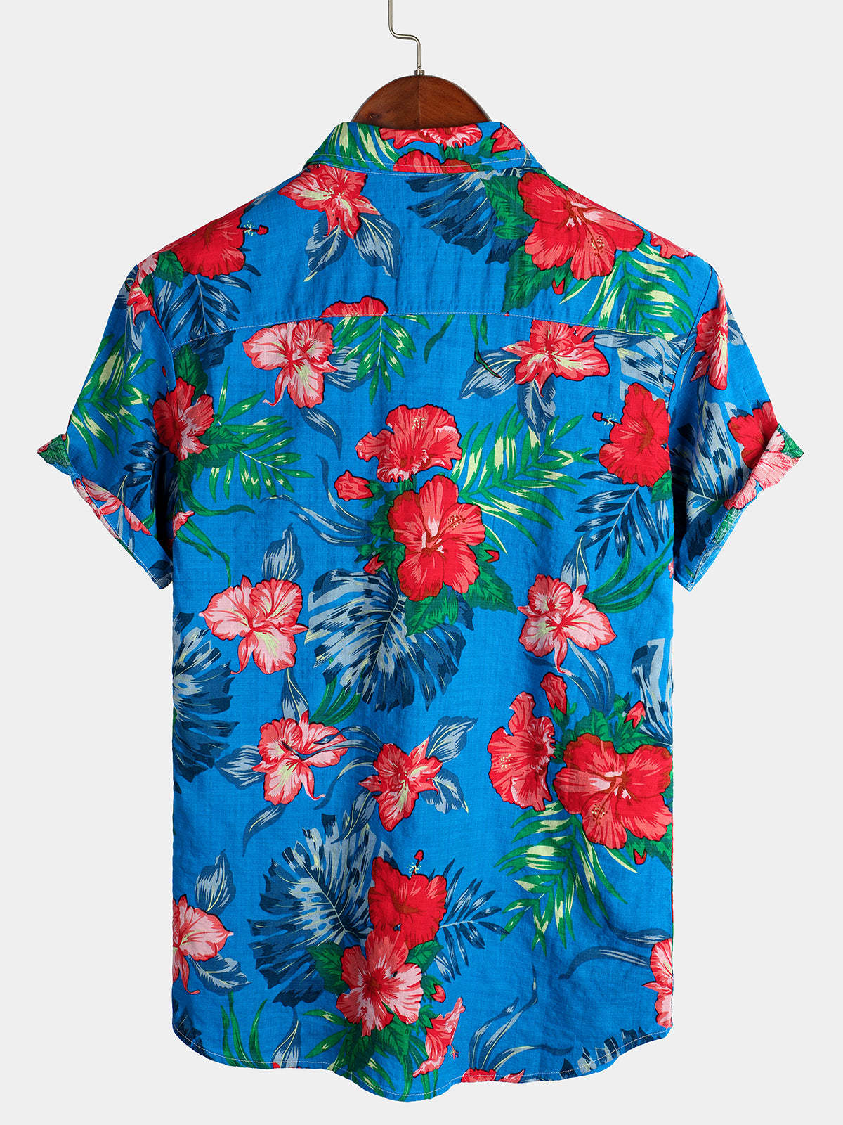 Men's Blue Flower Tropical Hawaii Cotton Short Sleeve Shirt