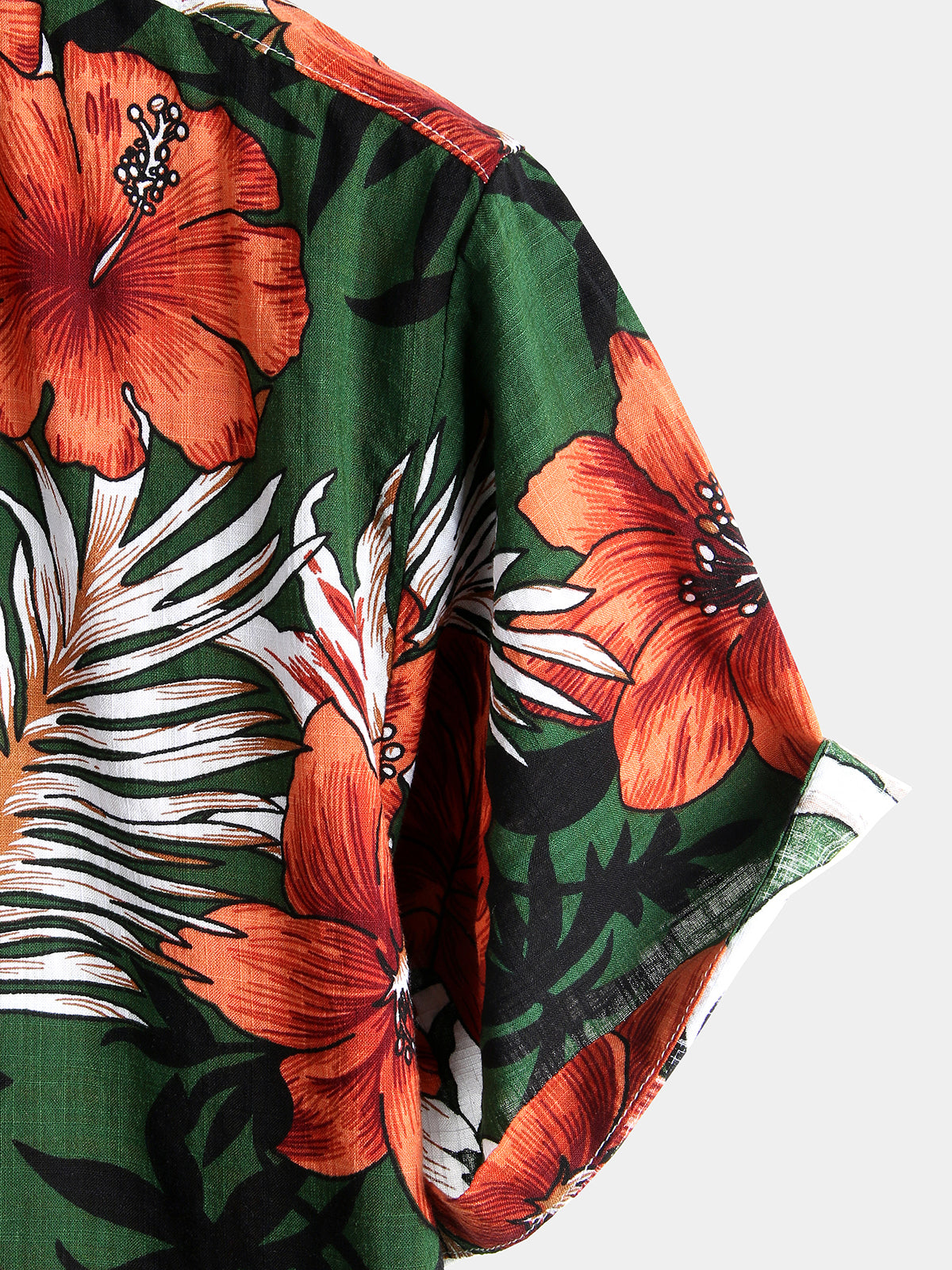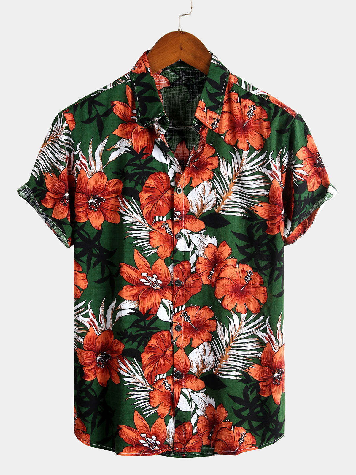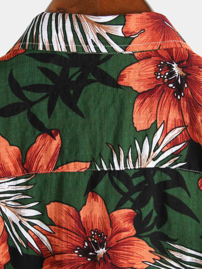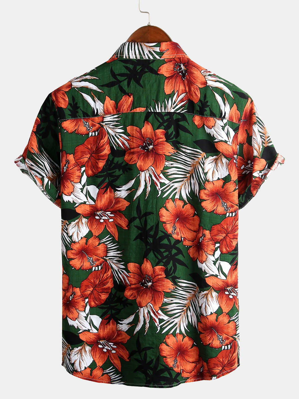 Men's Green Flower Tropical Hawaii Cotton Short Sleeve Shirt
