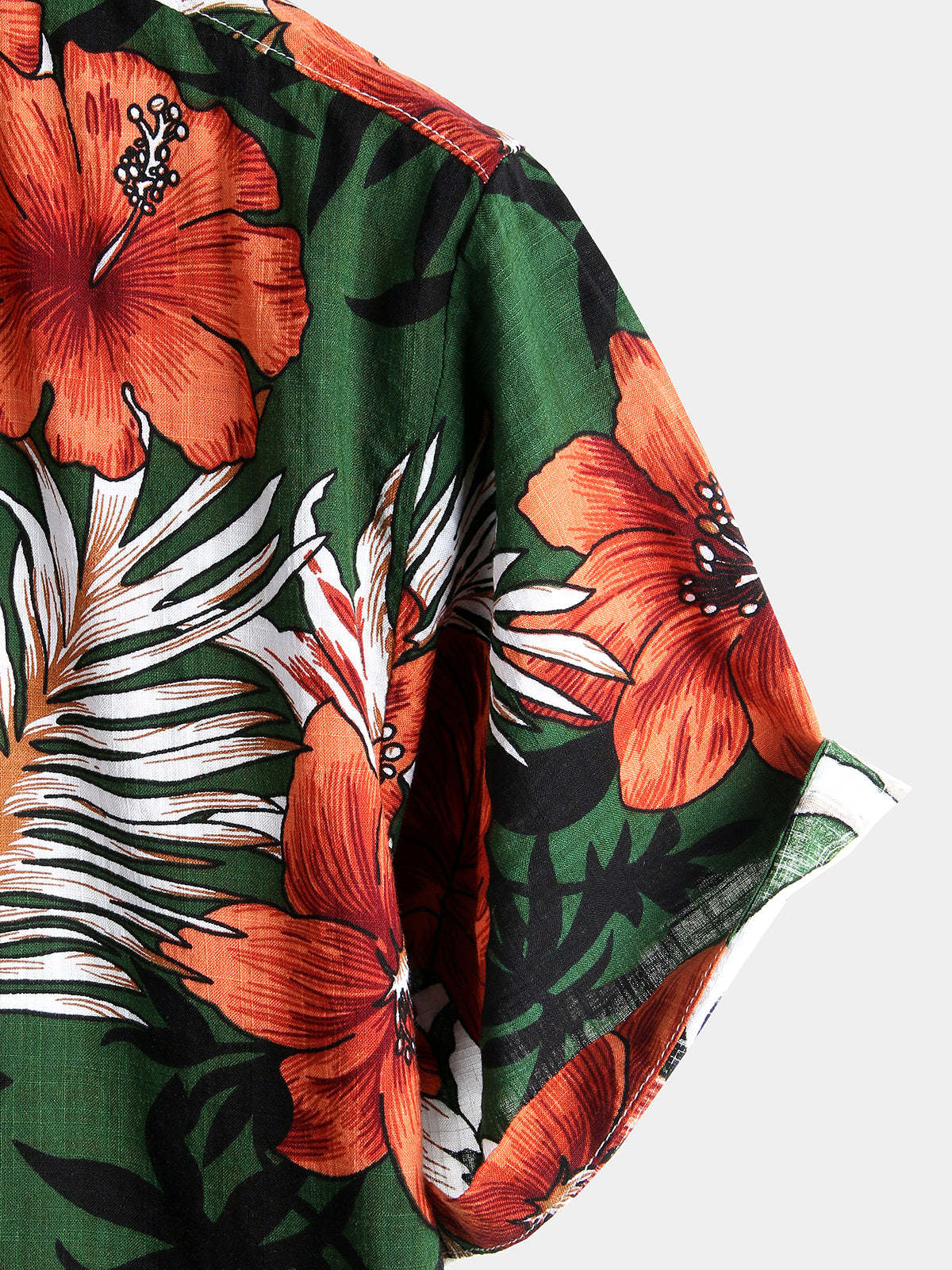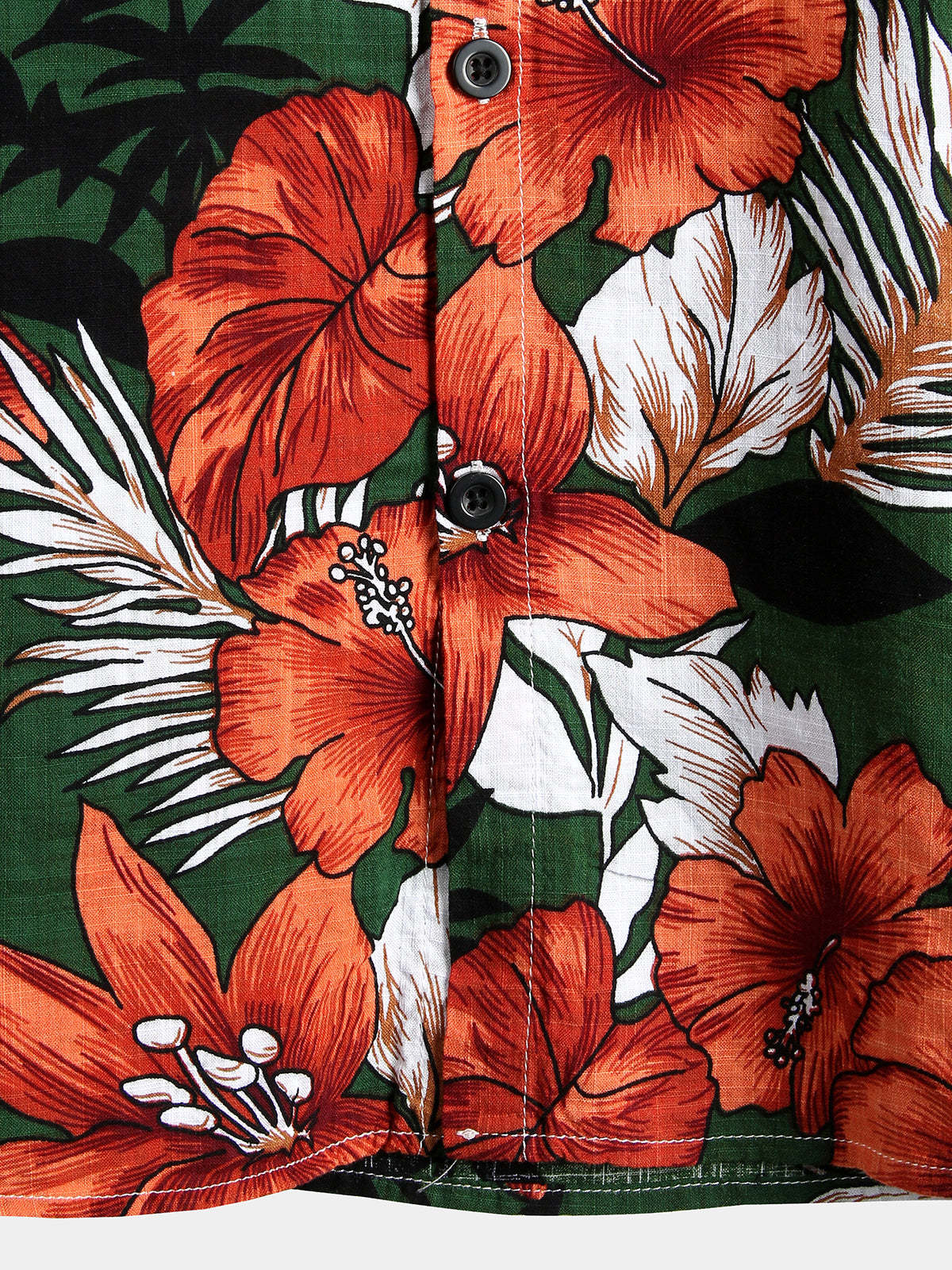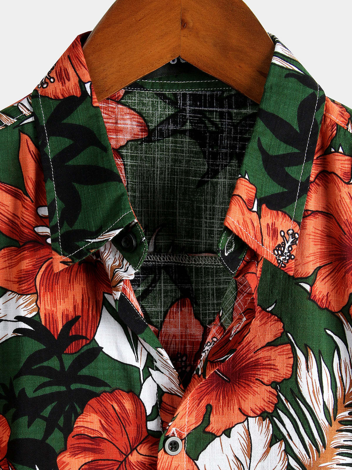 Men's Green Flower Tropical Hawaii Cotton Short Sleeve Shirt