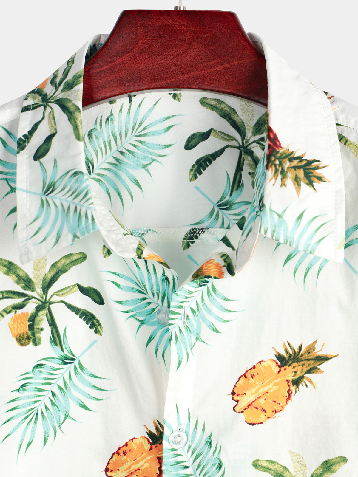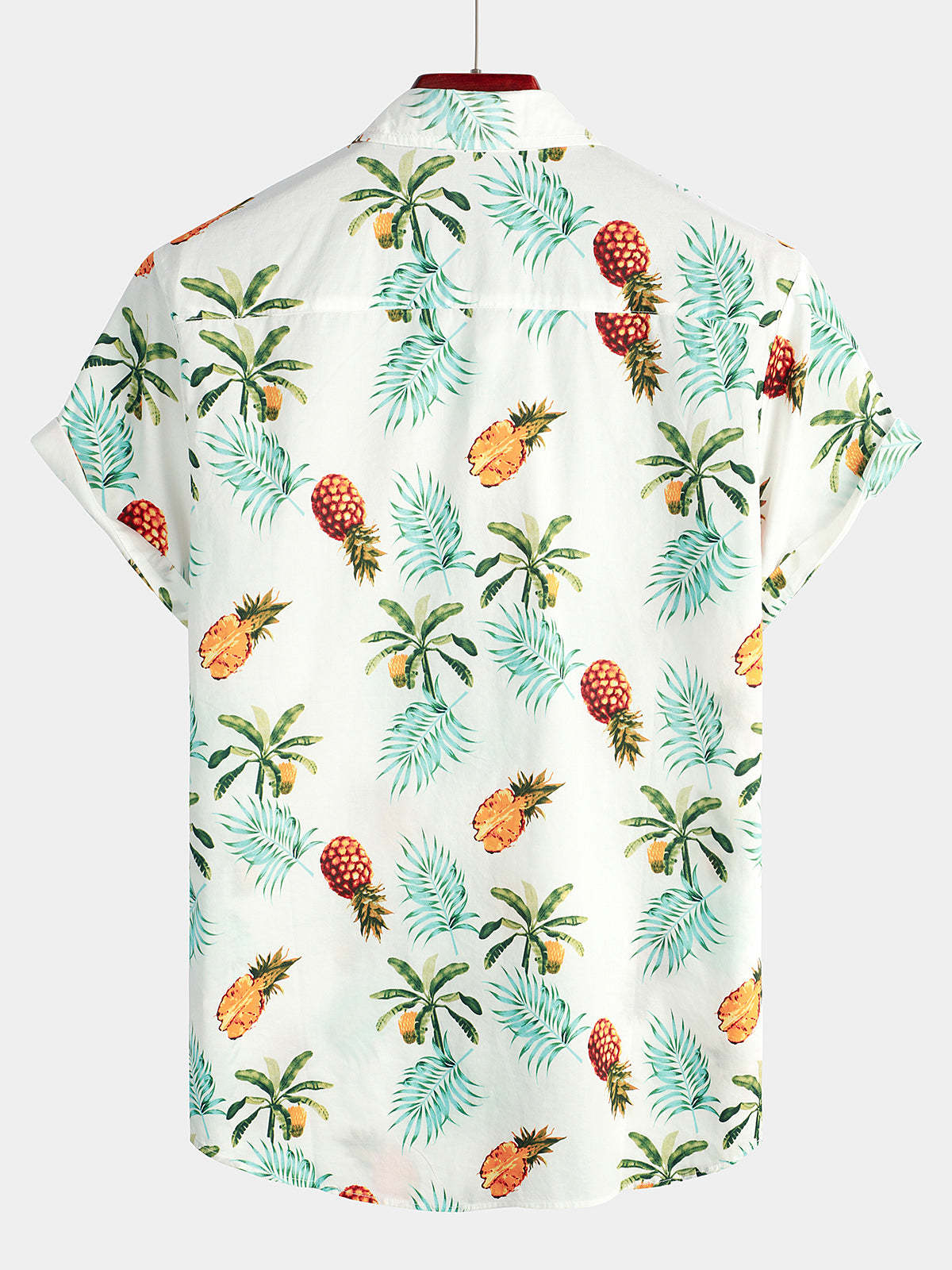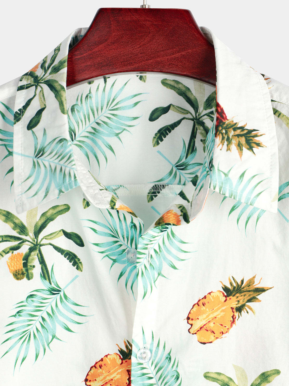 Men's Pineapple Print Cotton Tropical Fruit Holiday Short Sleeve Button Up Beach Hawaiian Shirt