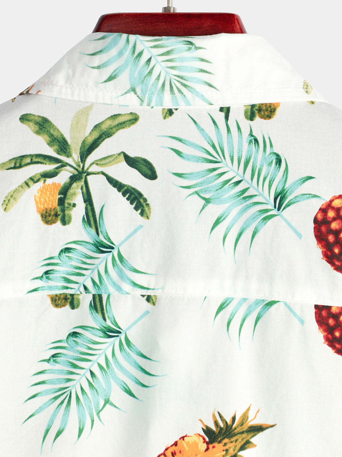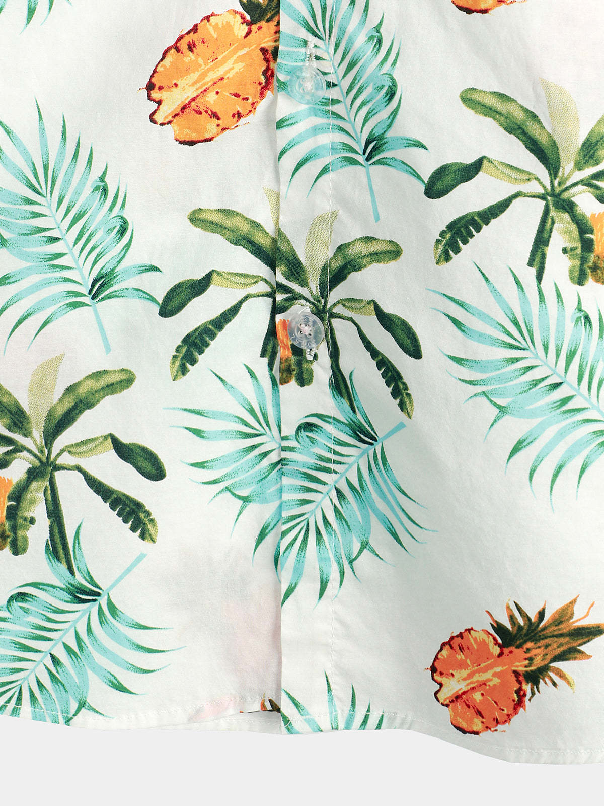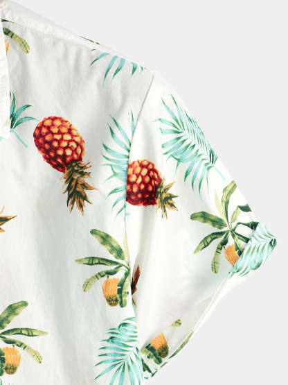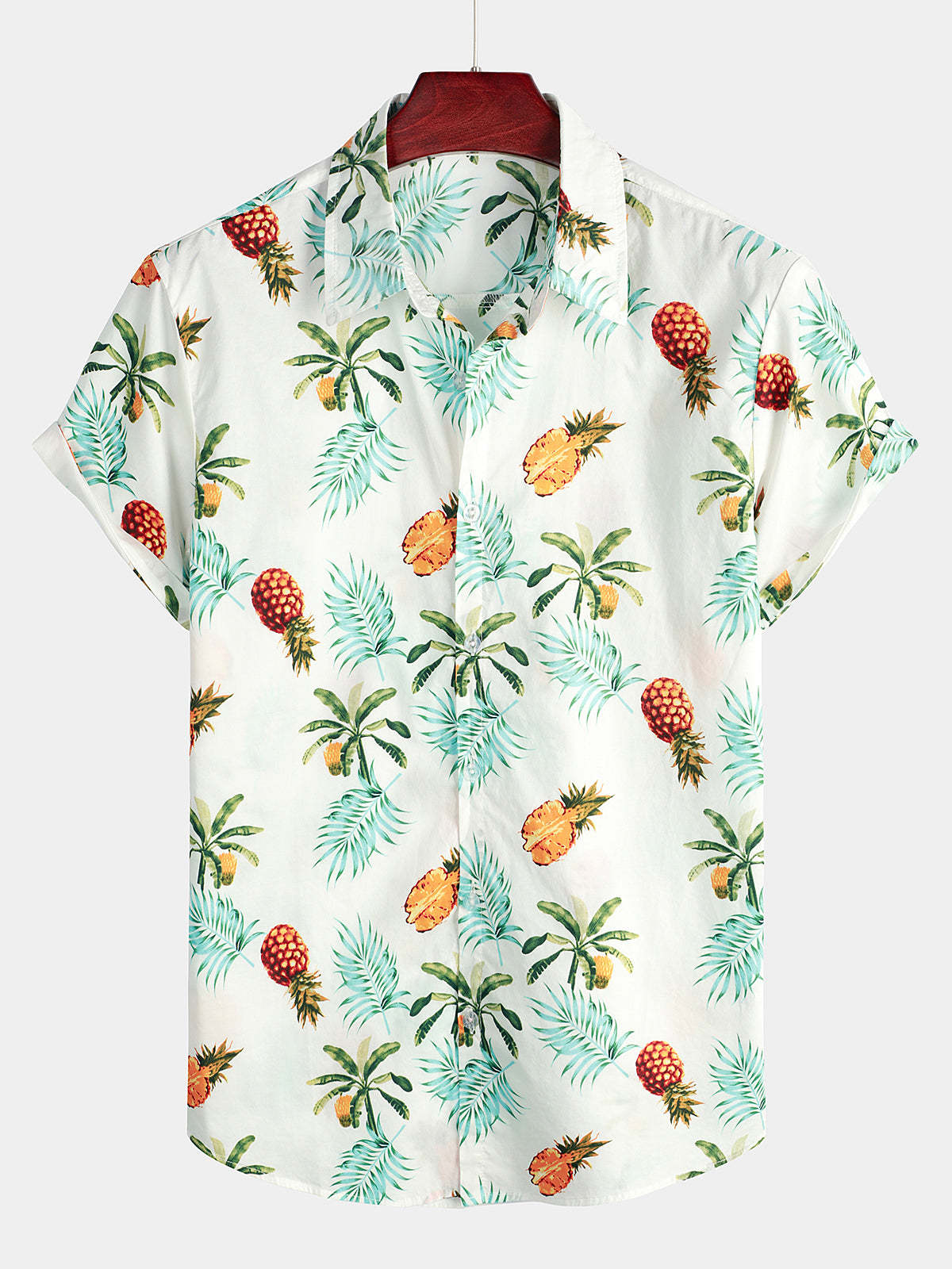 Men's Pineapple Print Cotton Tropical Fruit Holiday Short Sleeve Button Up Beach Hawaiian Shirt