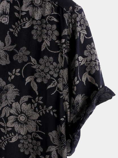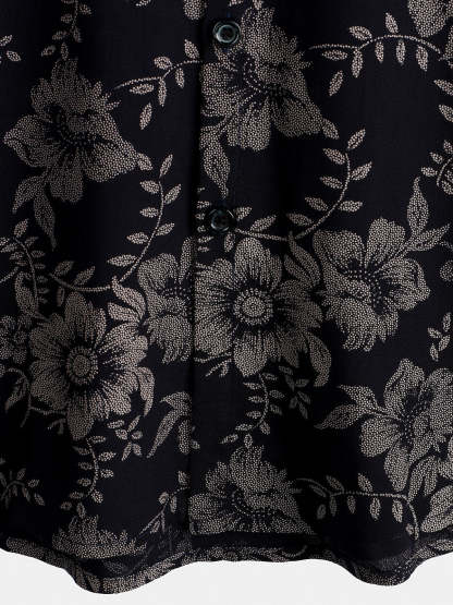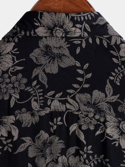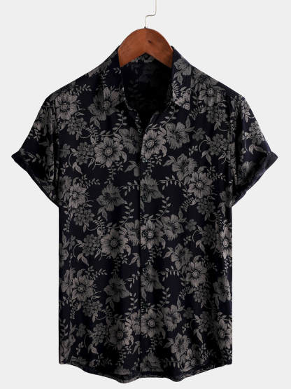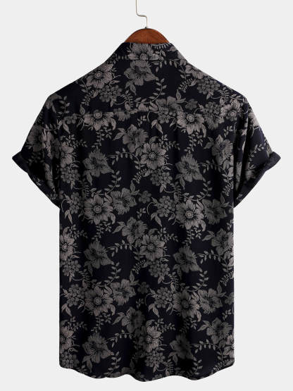 Men's Floral Print Vintage Flower Holiday Breathable Button Up Navy Blue Hawaiian Short Sleeve Shirt