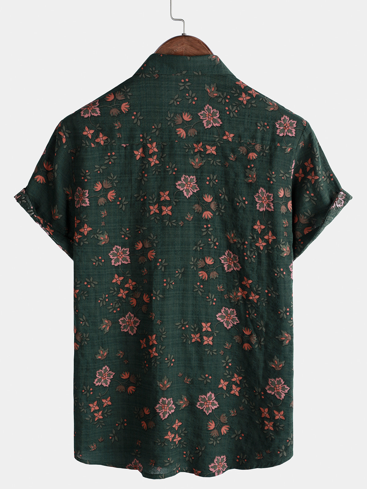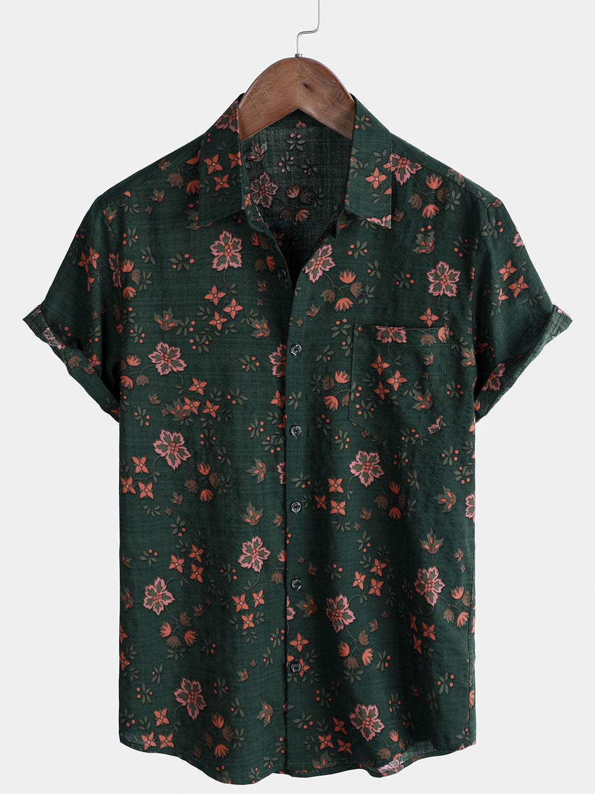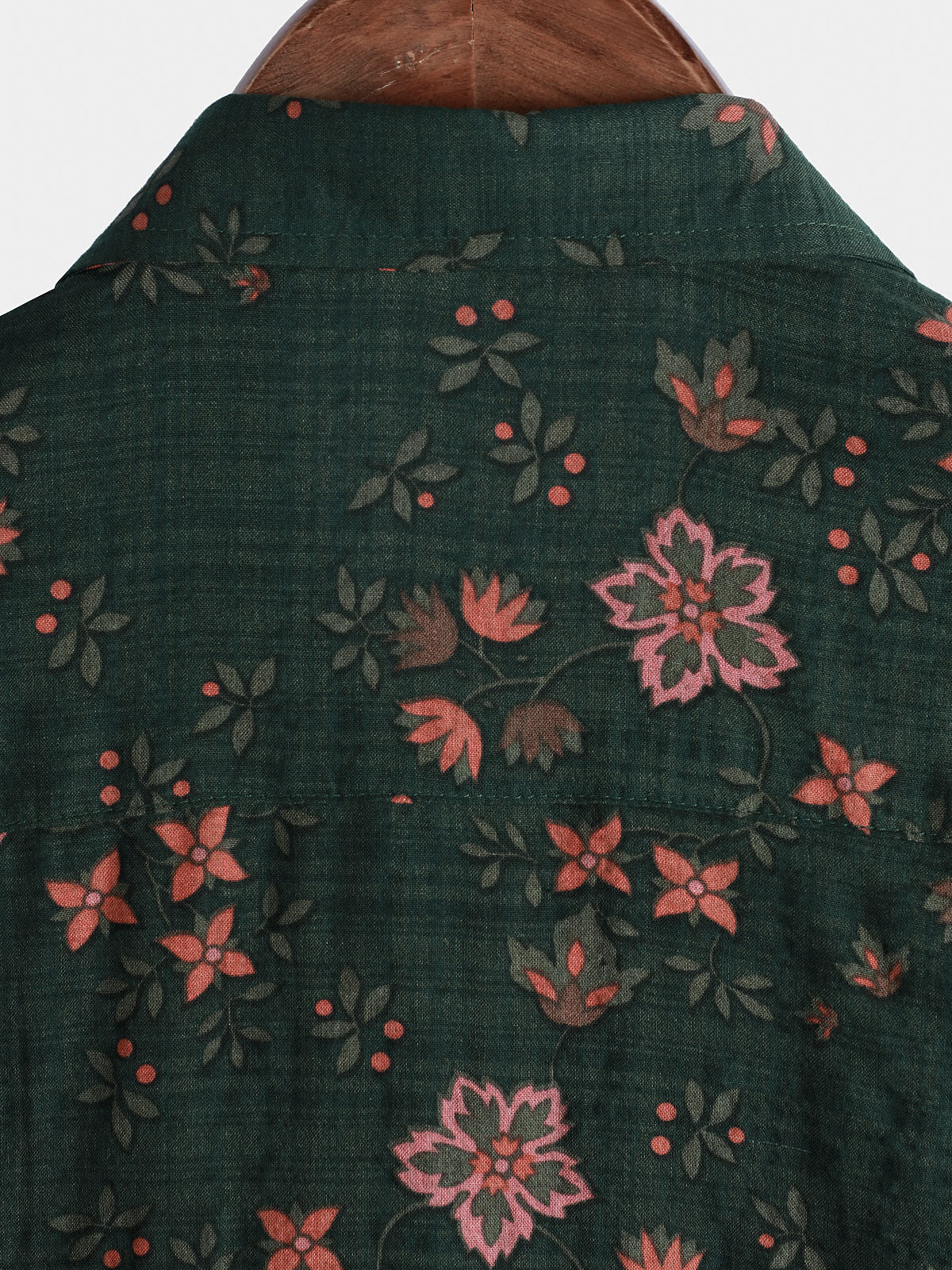 Men's Floral Print Vintage Holiday Green Hawaiian Short Sleeve Shirt