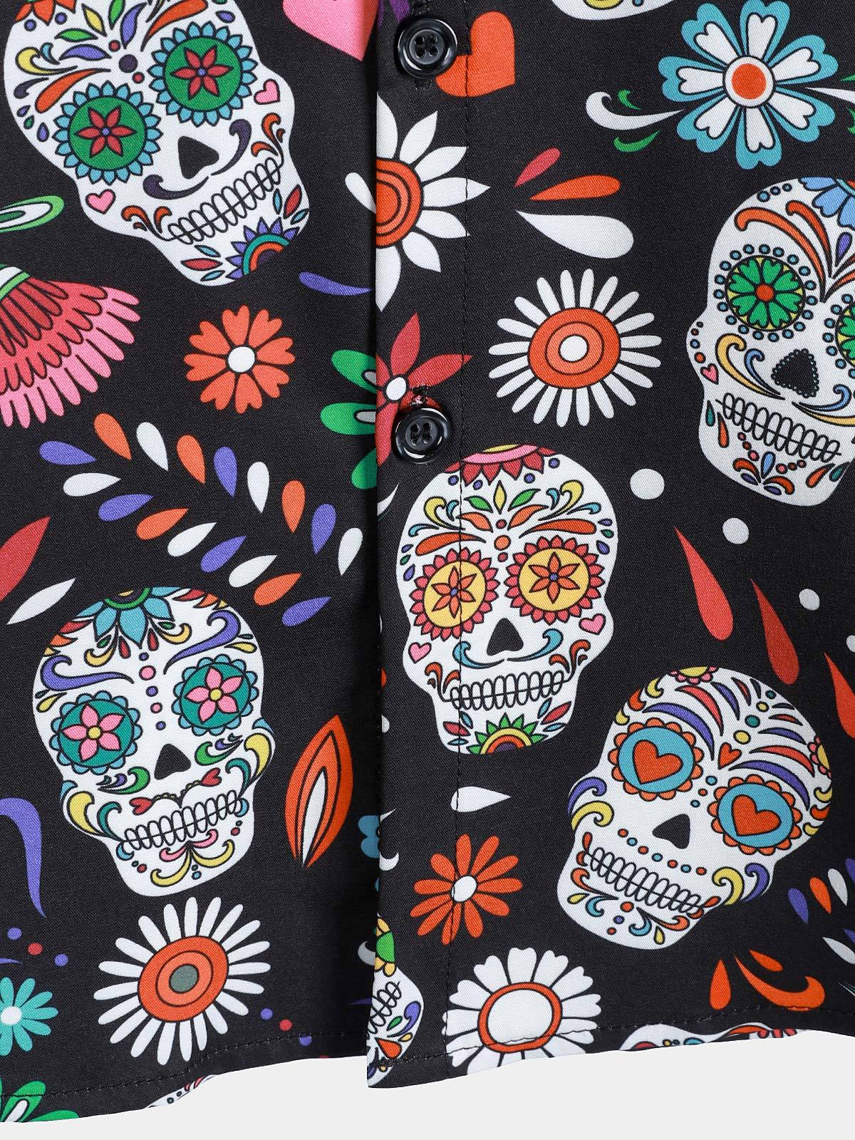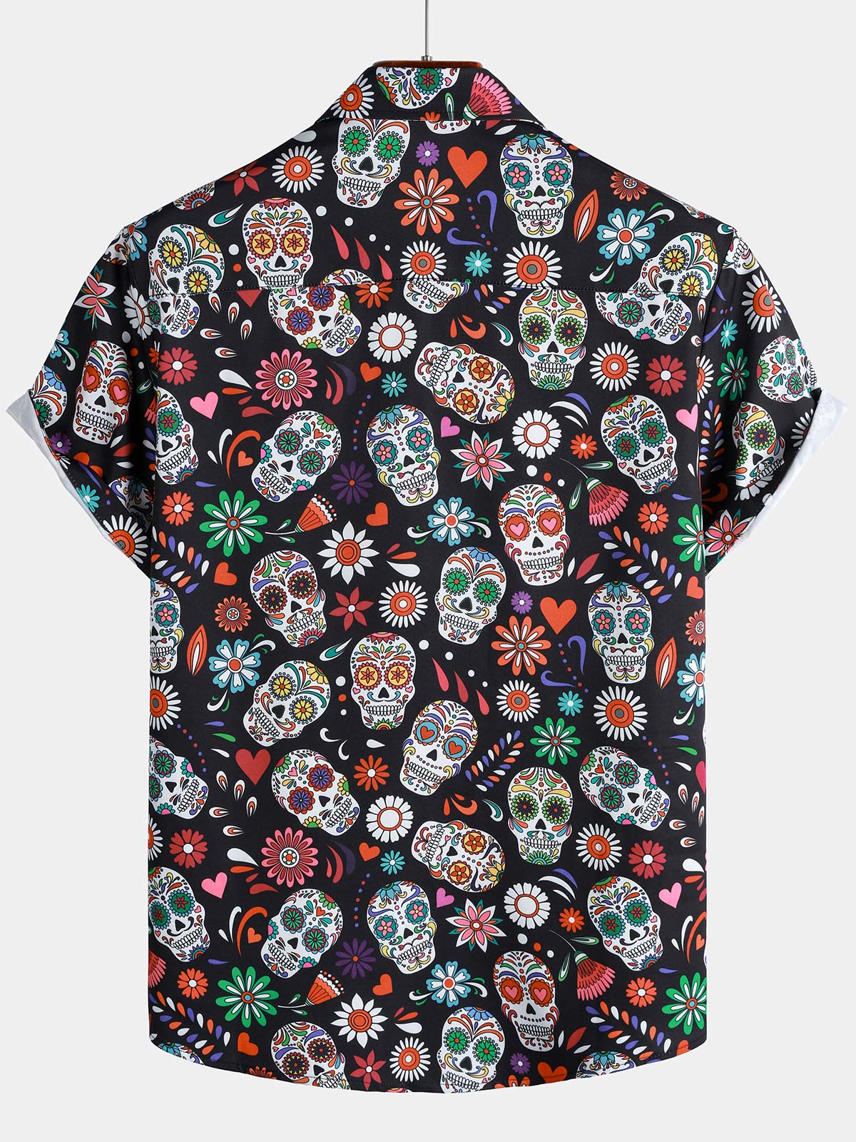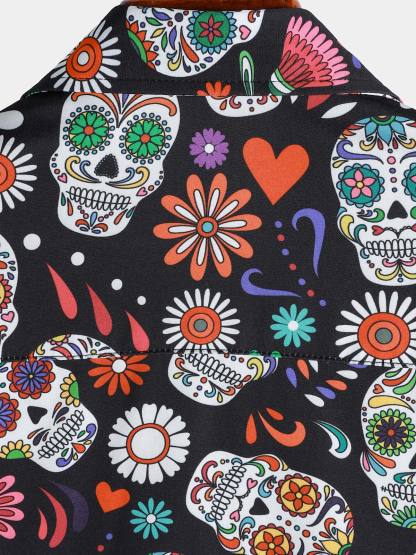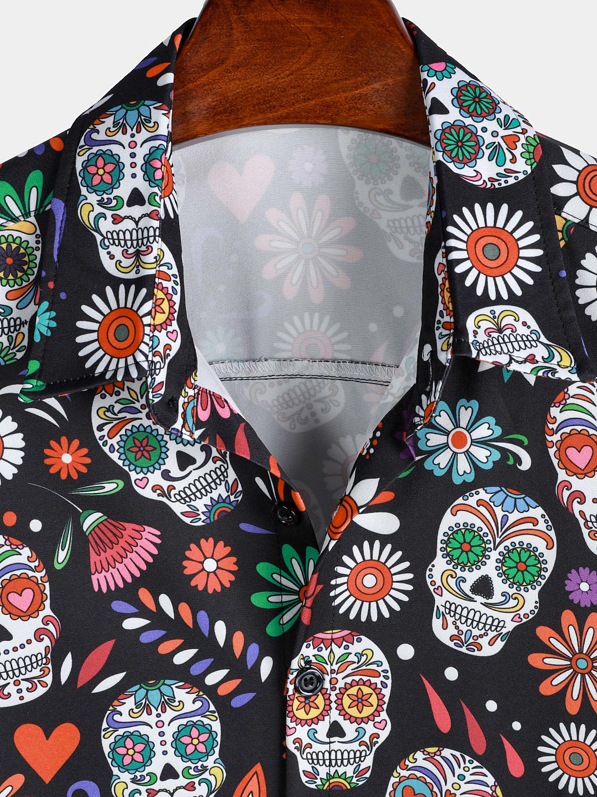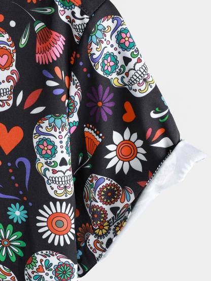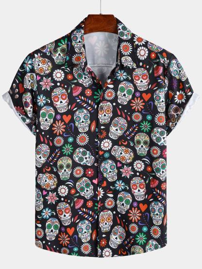 Men's Flower Skull Colorful Graphic Button Up Short Sleeve Punk Rock Art Shirt