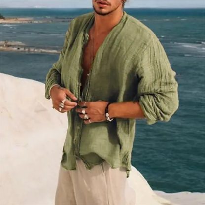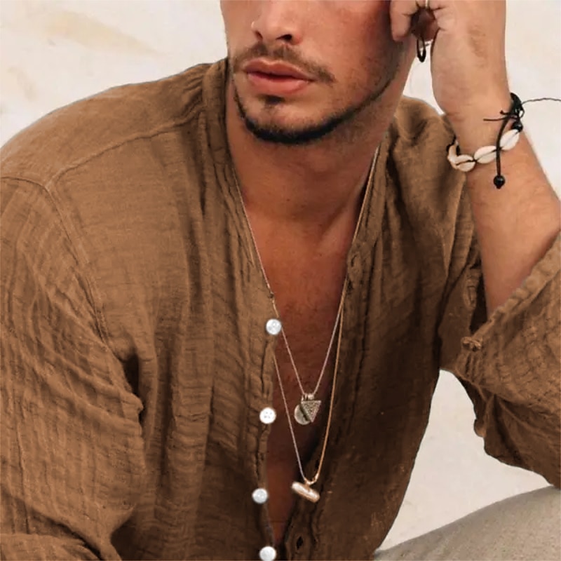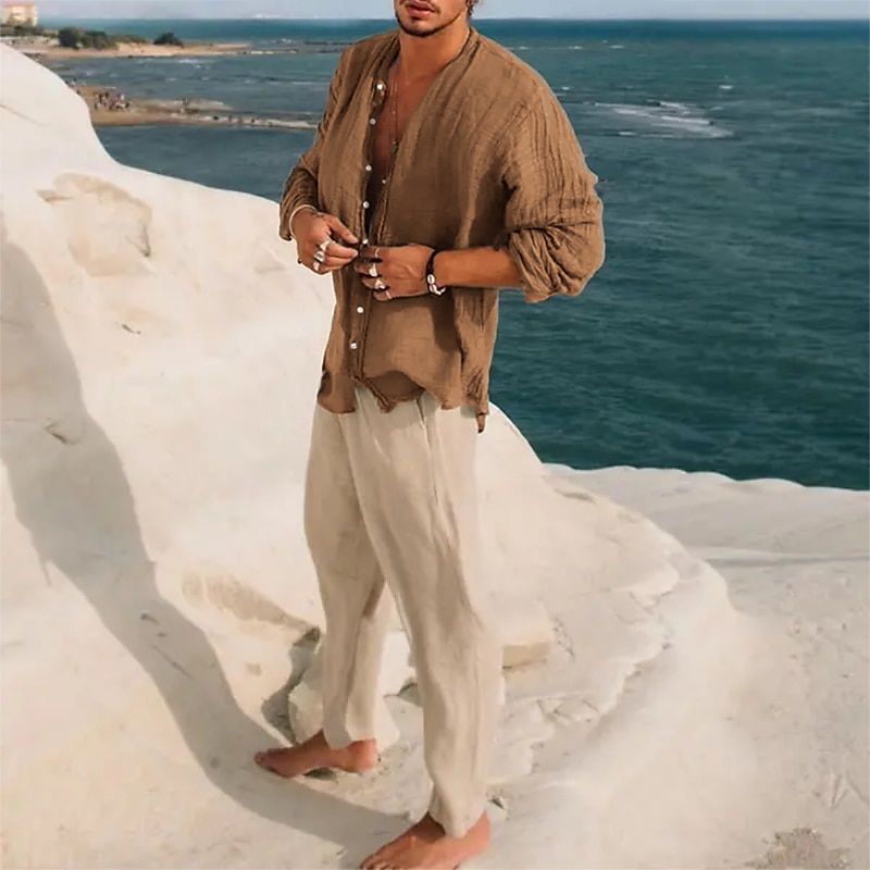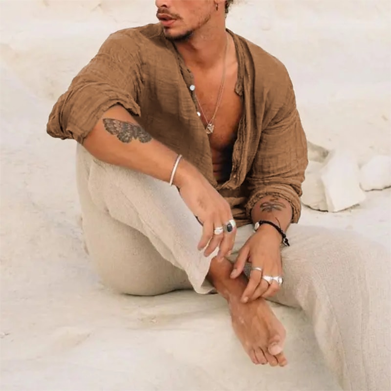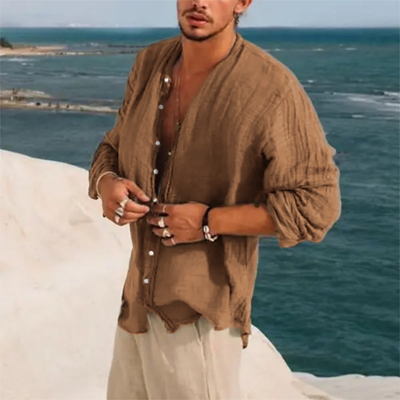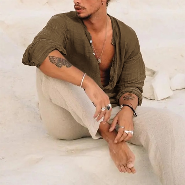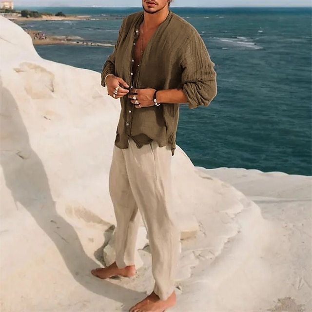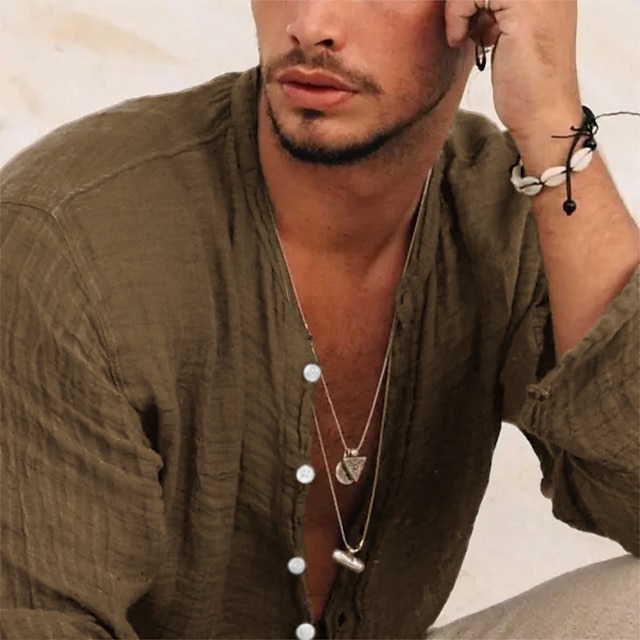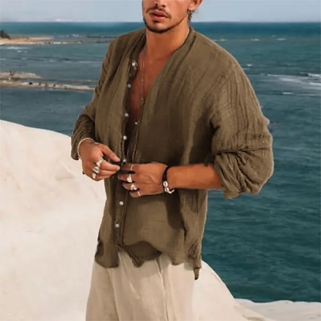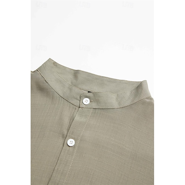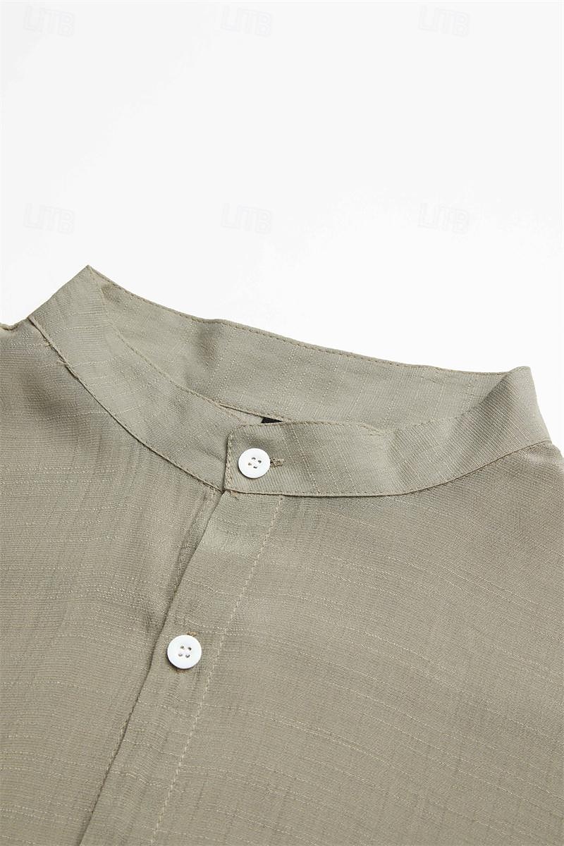Men's Linen Shirt Band Collar Shirt Summer Shirt Beach Wear Button Up Shirt Plain Vacation Casual Black Green Khaki Gray Long-Sleeve Stand Collar Summer Spring Clothing Apparel