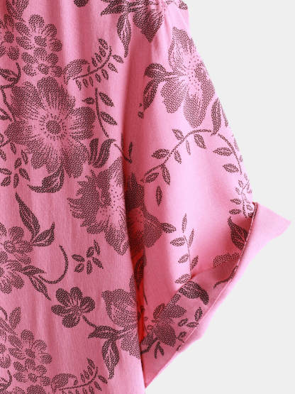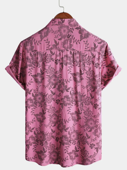 Men's Pink Floral Print Vintage Holiday Breathable Button Up Hawaiian Short Sleeve Shirt