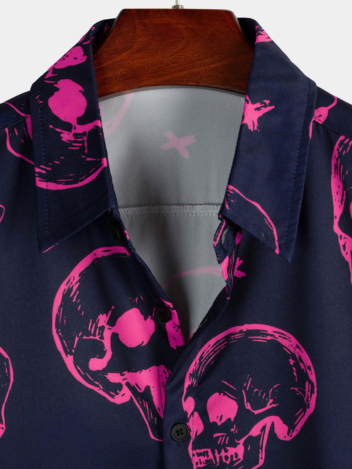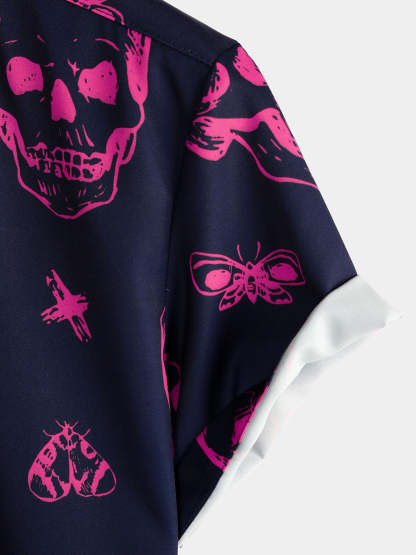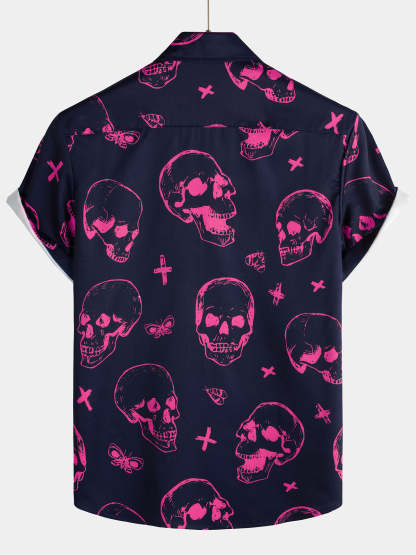 Men's Pink Skull Print Art Graphic Button Short Sleeve Aloha Hawaiian Shirt
