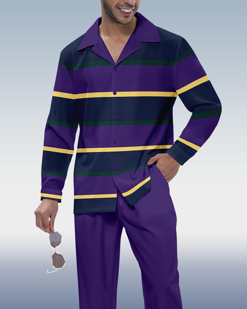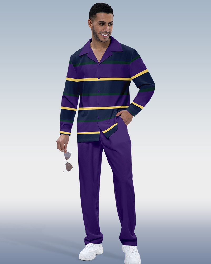 Men's Purple Stripe Printed Long Sleeve Shirt Walking Suit 42