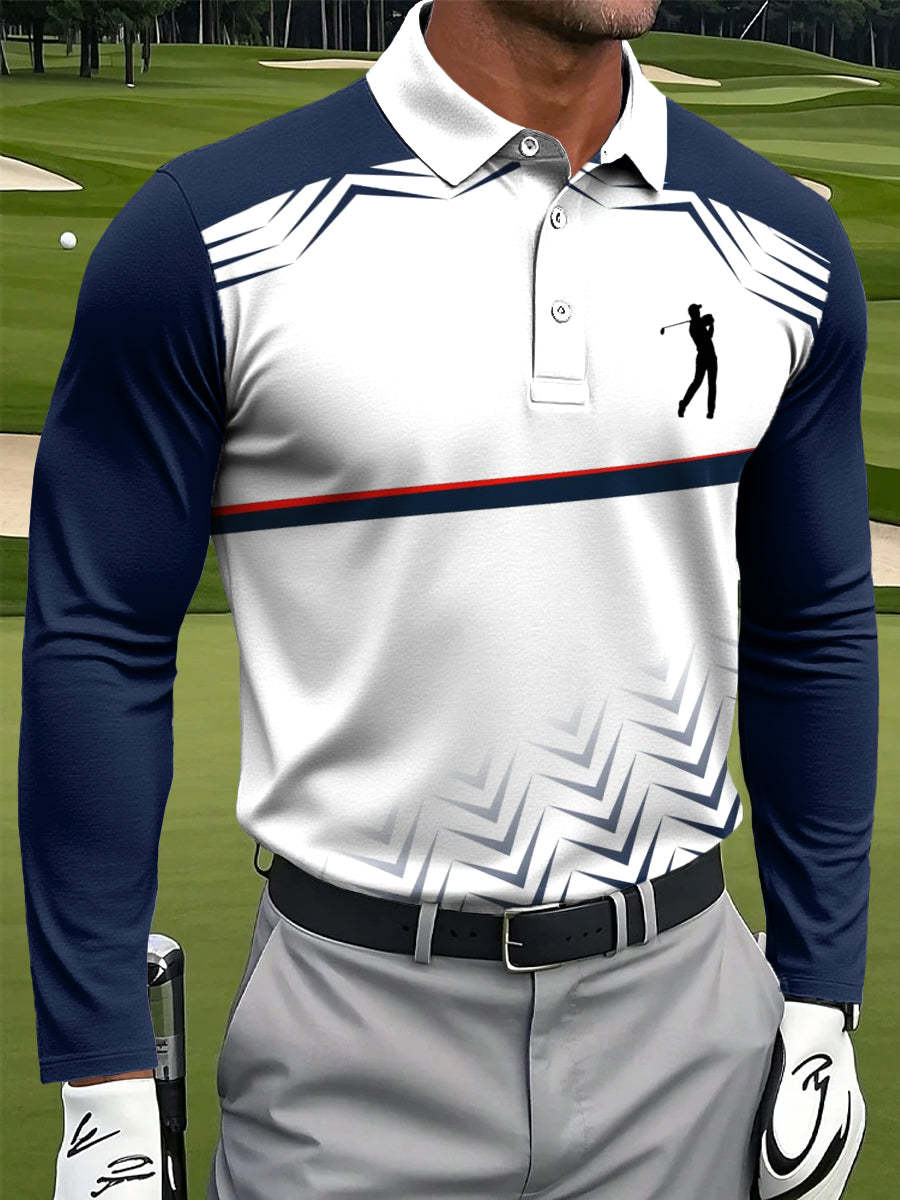 Men's Retro Abstract Line Geometric Art Print Casual Business Long Sleeve Polo Shirt