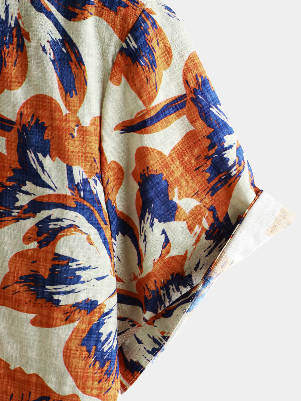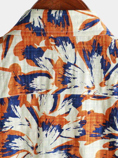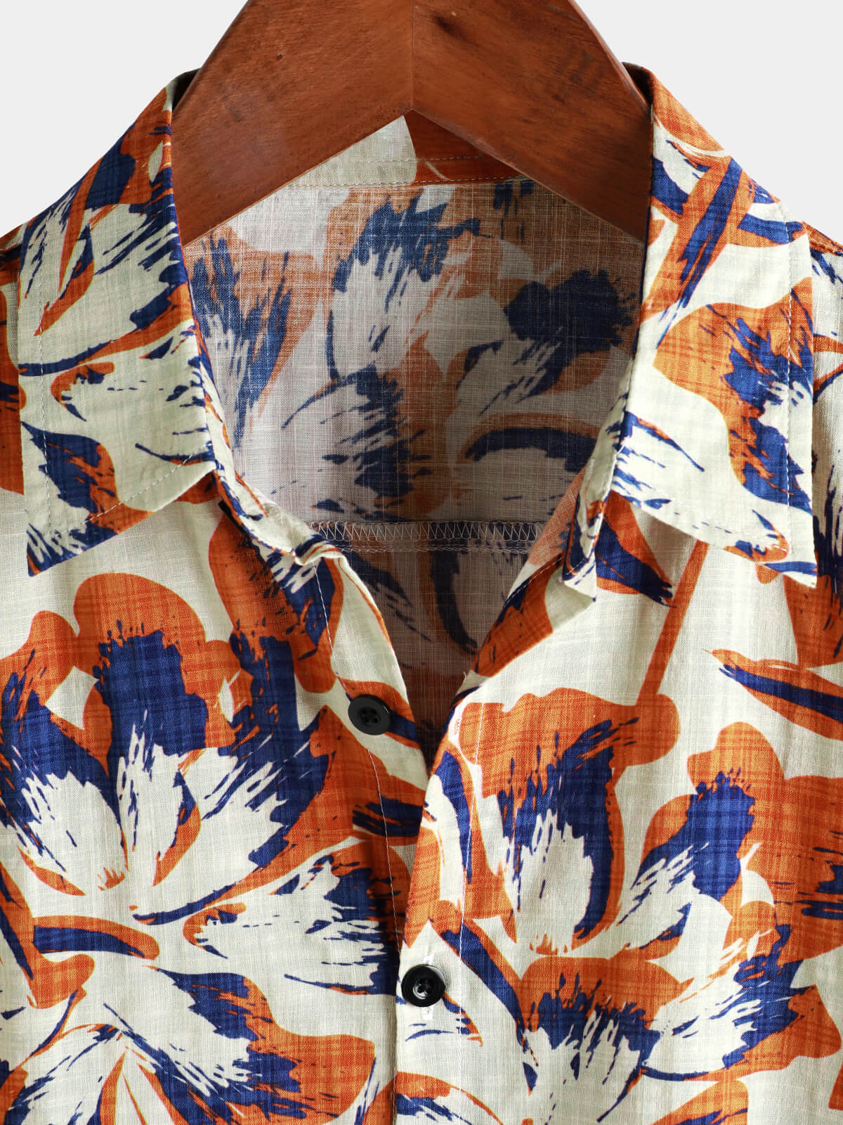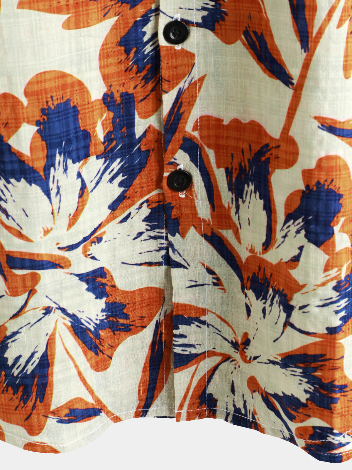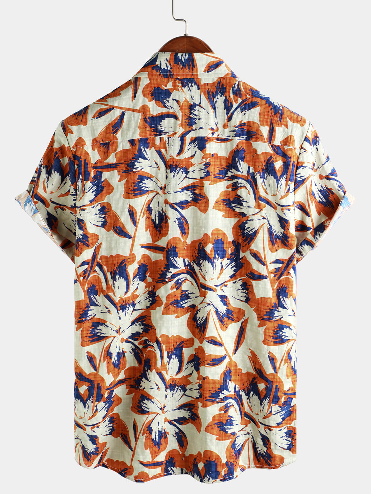 Men's Retro Floral Orange Short Sleeve Button Up Shirt