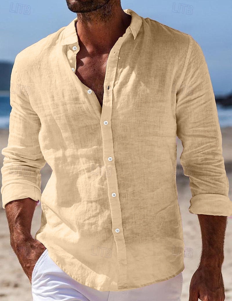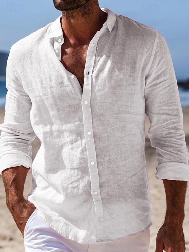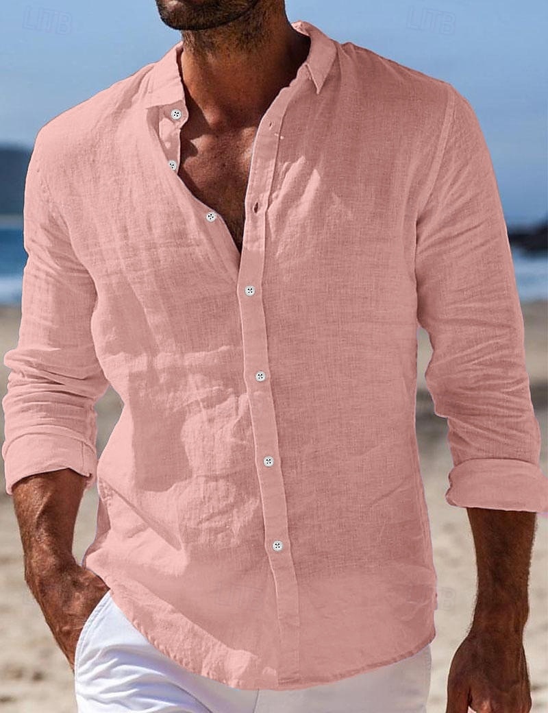 Men's Shirt Linen Shirt Summer Shirt Beach Wear Button Up Shirt Plain Casual Daily Black White Pink Navy Blue Long-Sleeve Turndown Spring & Summer Clothing Apparel