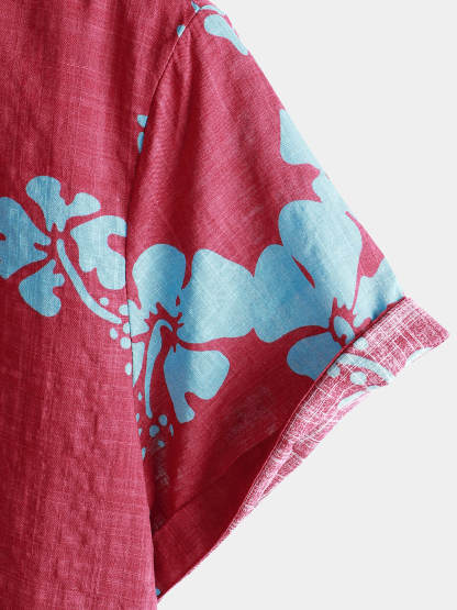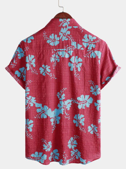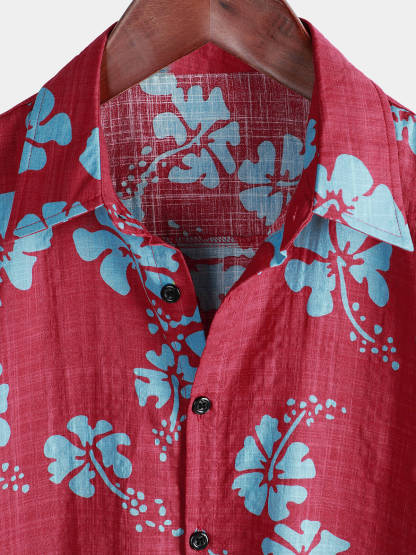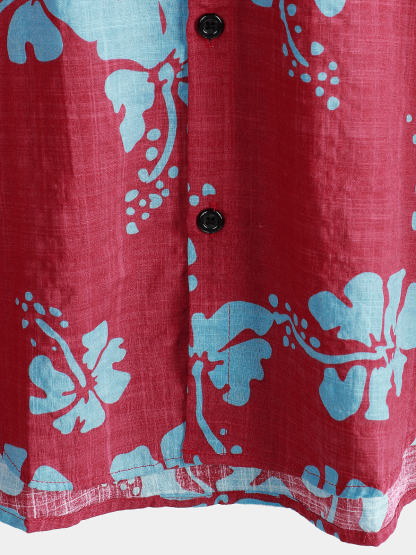 Men's Short Sleeve Red Floral Button Up Beach Tropical Hawaiian Shirt