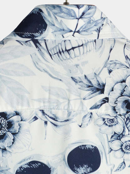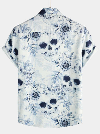 Men's Skull Floral Print Casual Lapel Button Short Sleeve Shirt