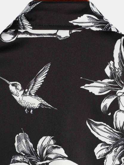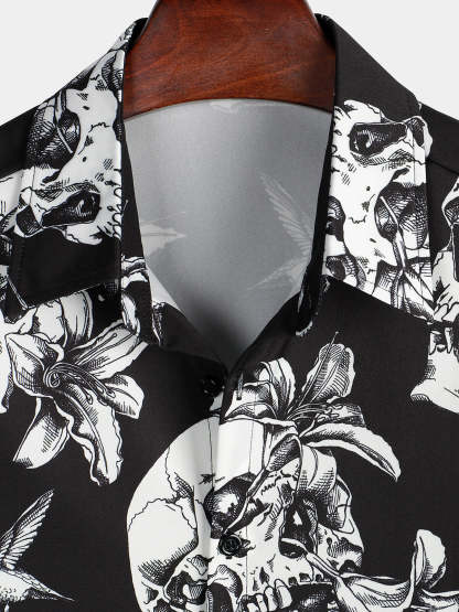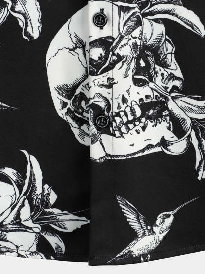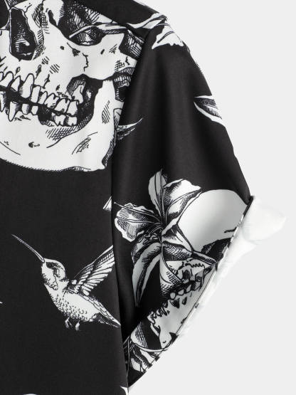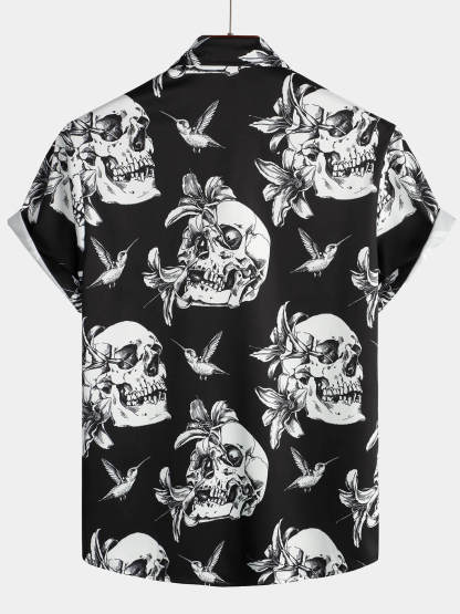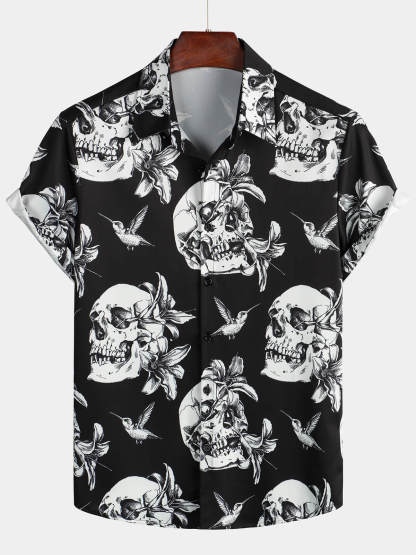 Men's Skull Hummingbird Punk Rocker Cool Rock Button Up Short Sleeve Black Hawaiian Shirt