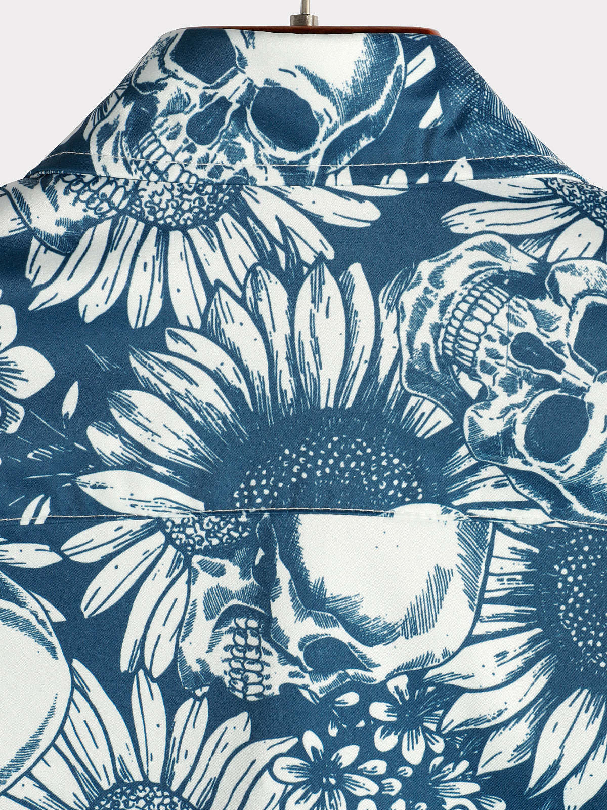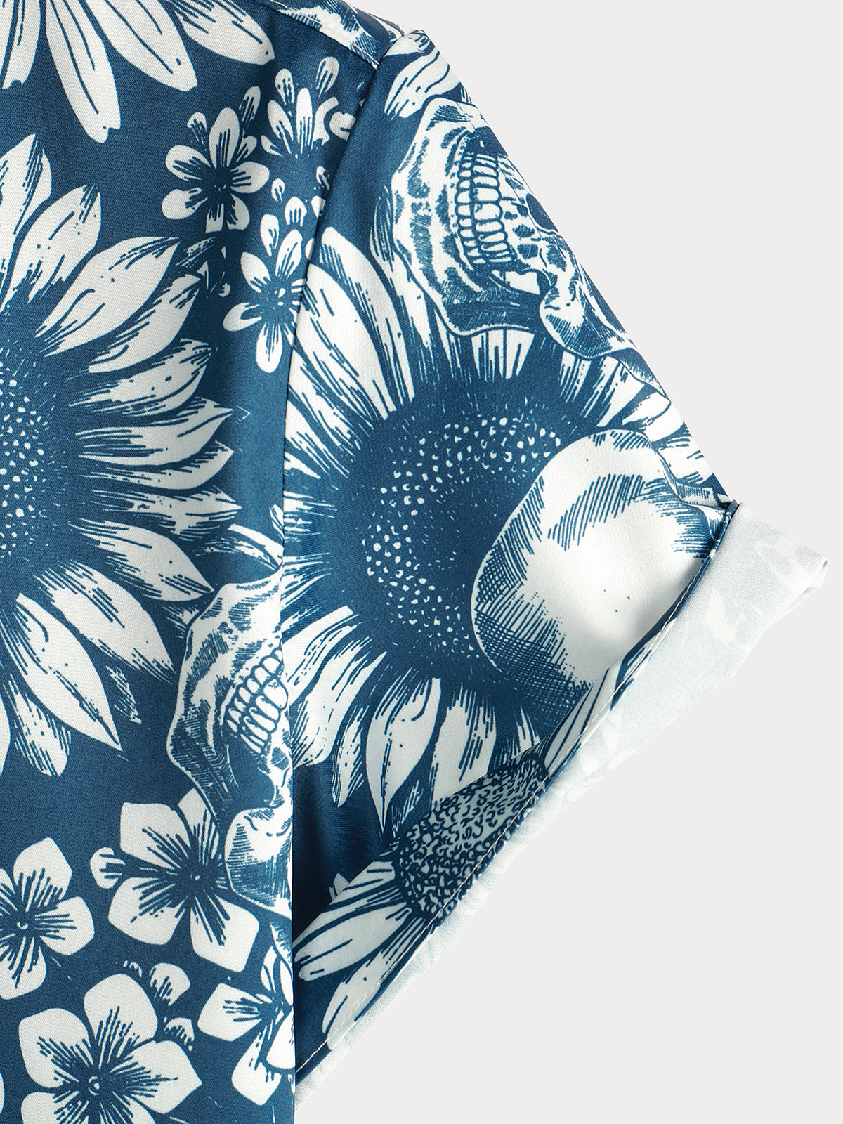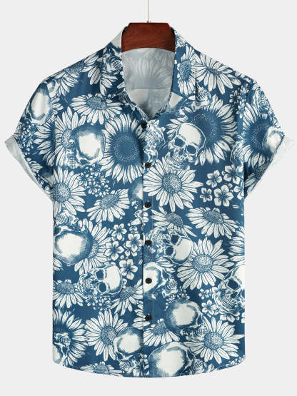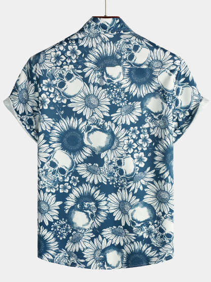 Men's Skull Sunflower Button Up Short Sleeve Art Flower Blue Rock and Roll Hawaiian Shirt