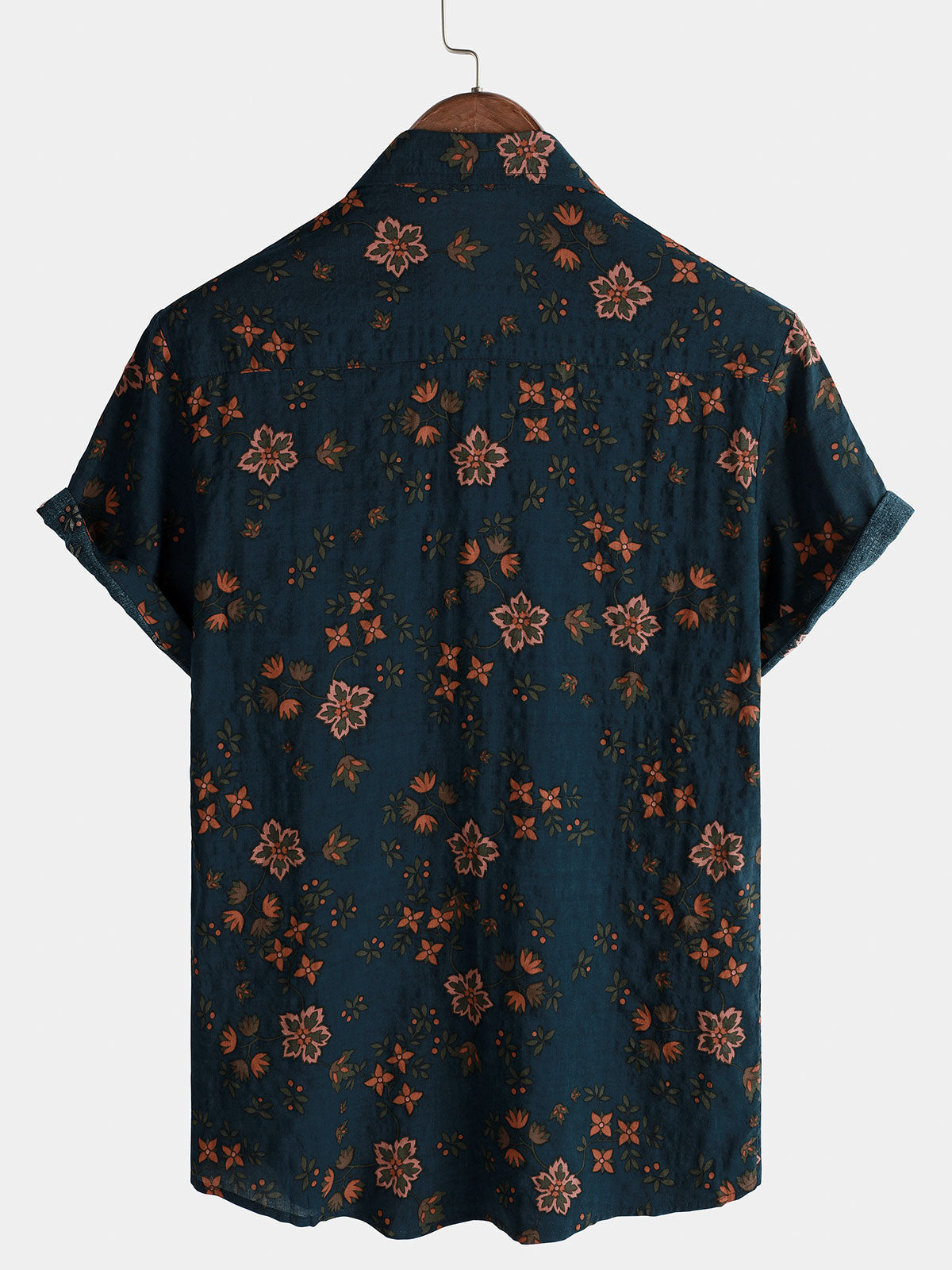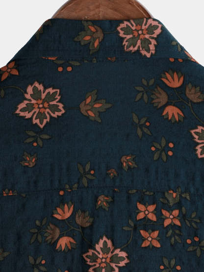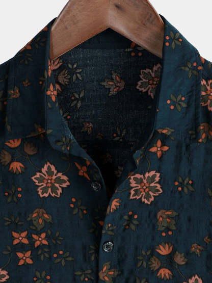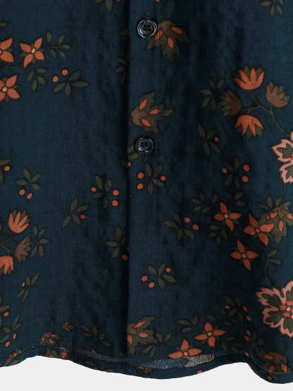 Men's Summer Floral Navy Blue Button Up Short Sleeve Cotton Shirt