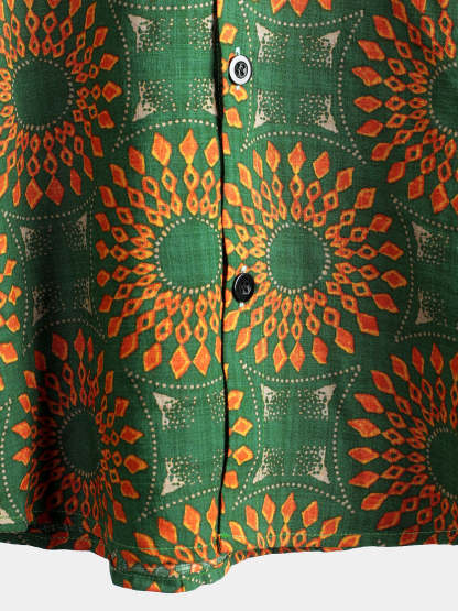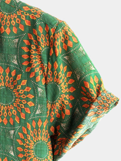 Men's Cotton Vintage 70s Floral Retro Button Up Green Summer Beach Bohemian Boho Short Sleeve Shirt