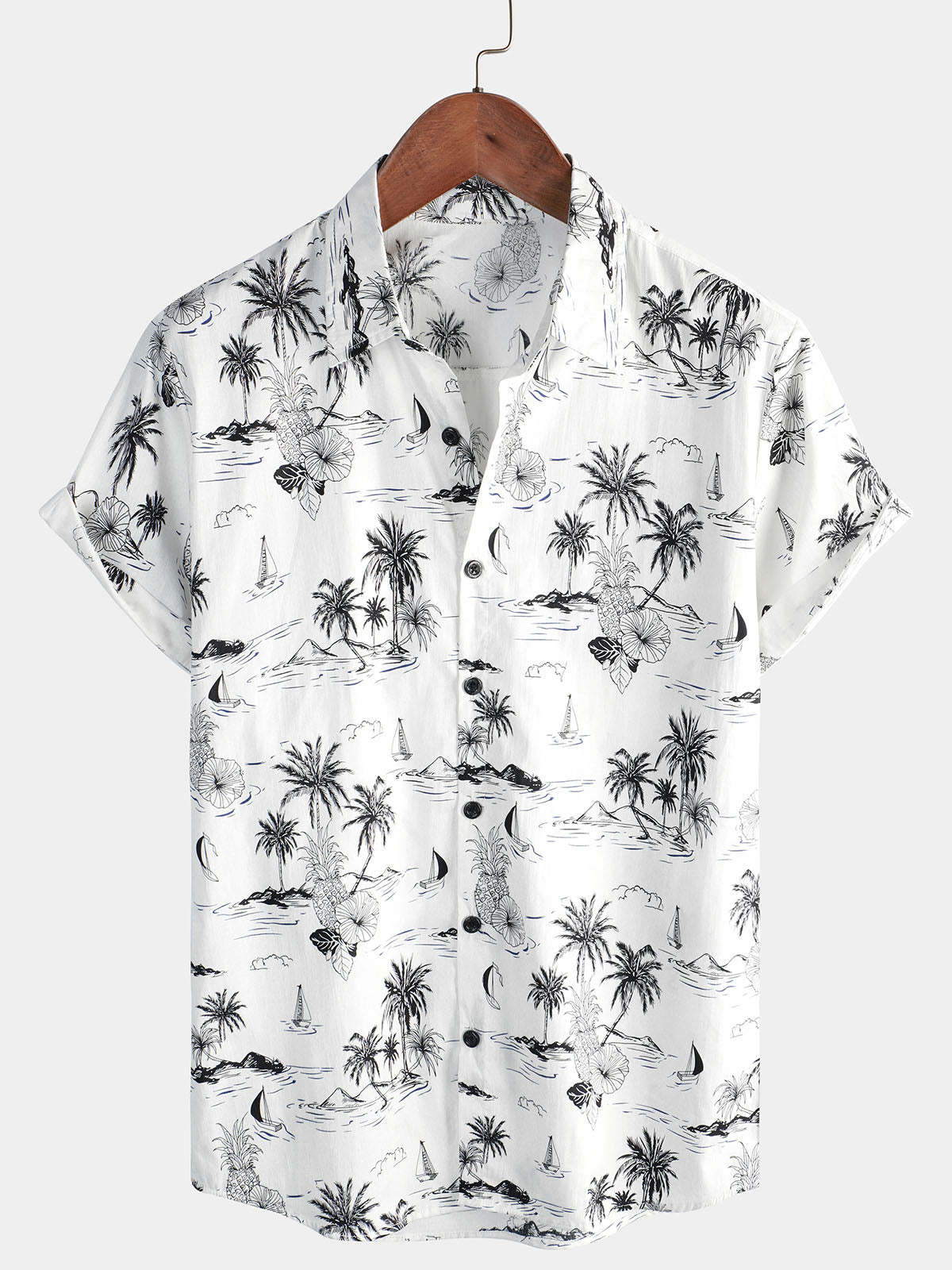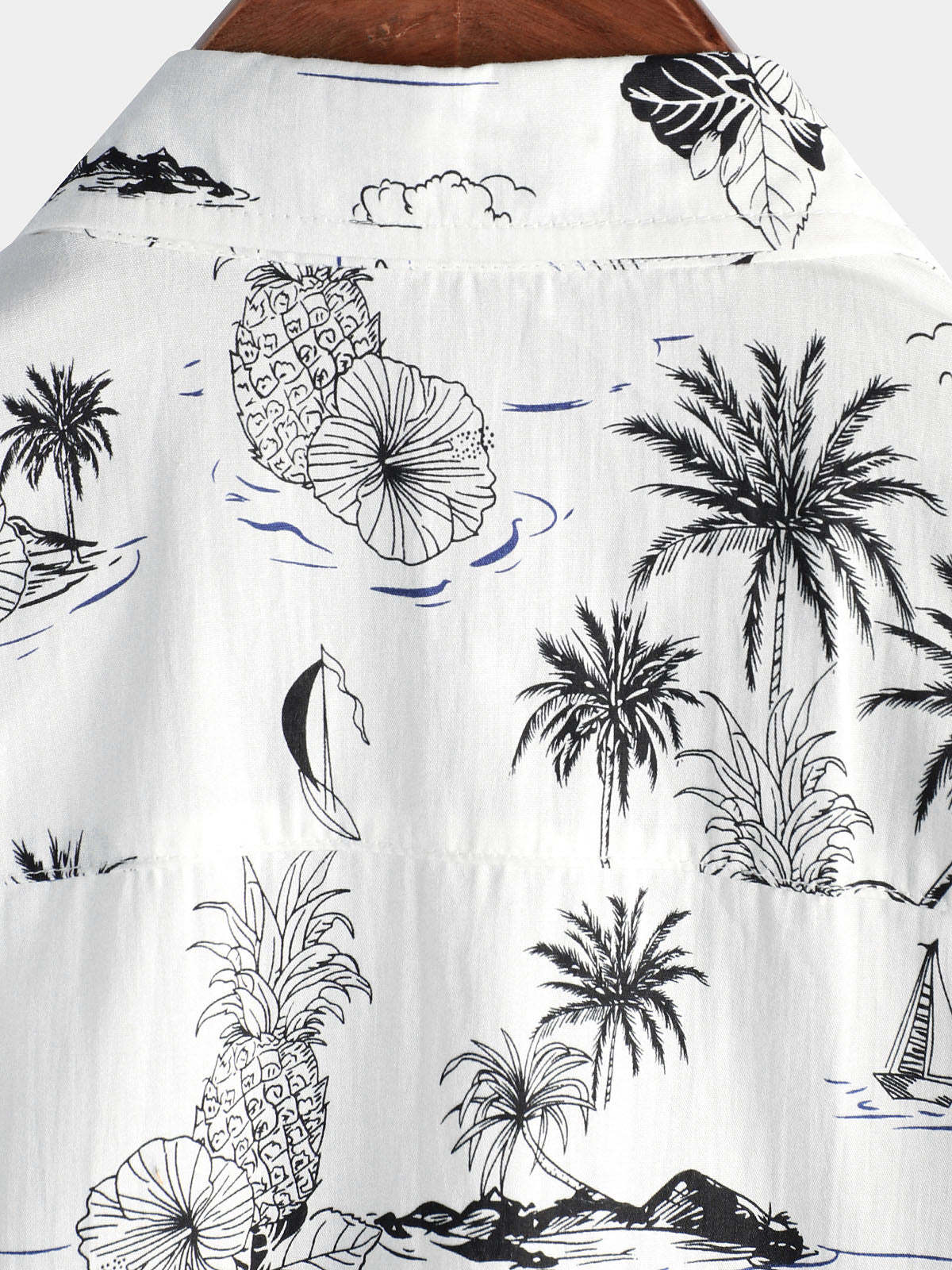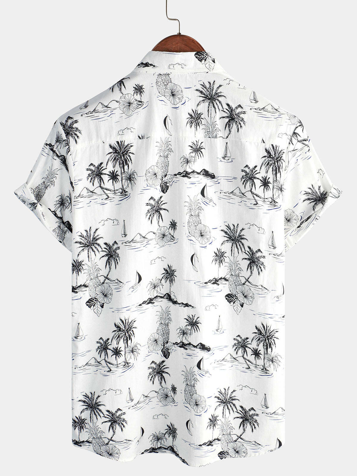 Men's Tropical Pineapple Palm Tree Print Aloha Short Sleeve White Hawaiian Shirt