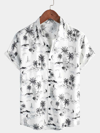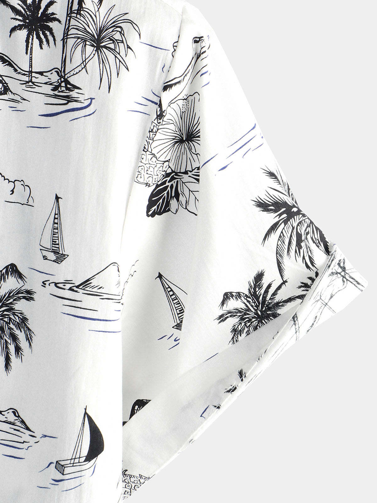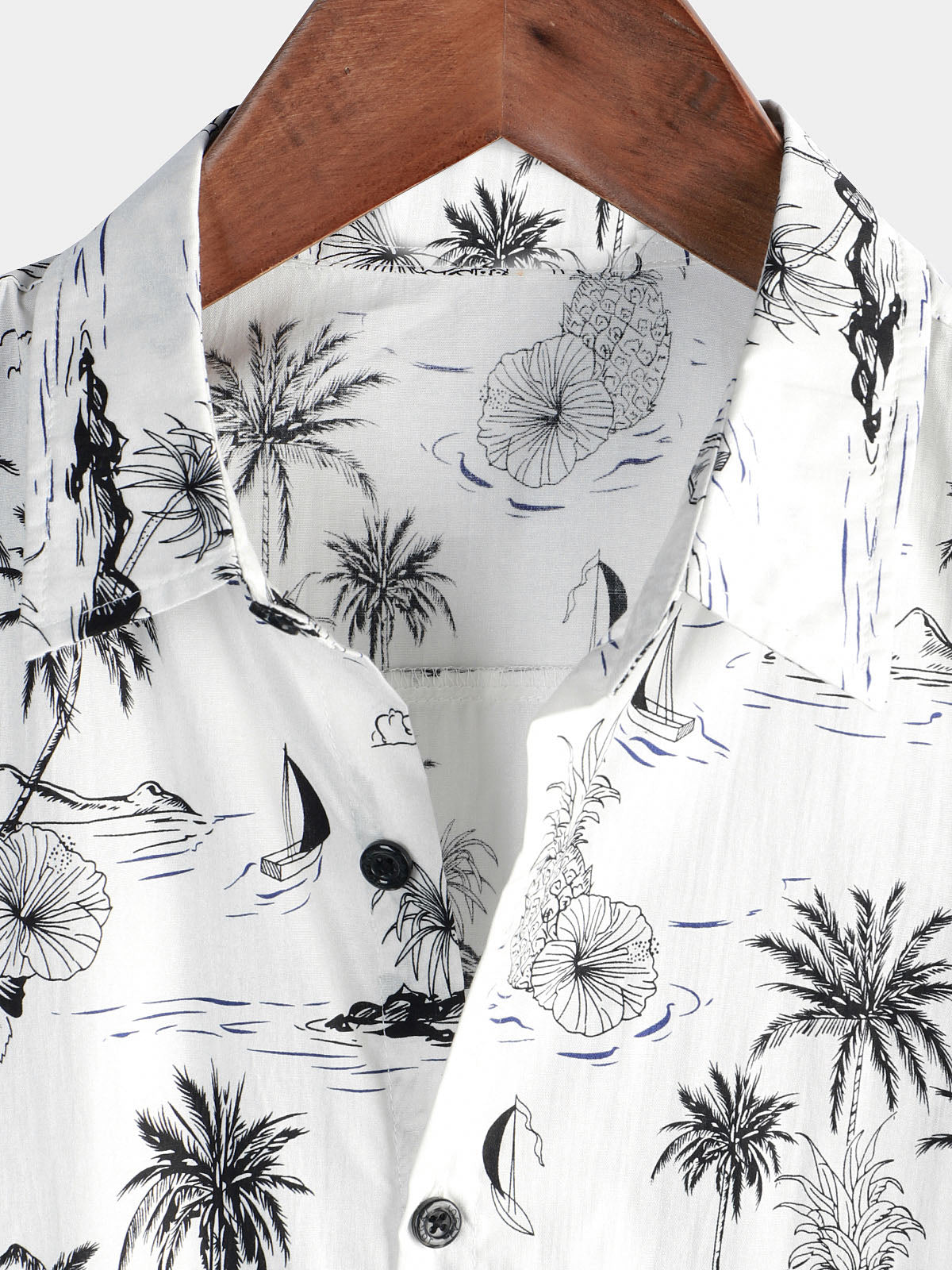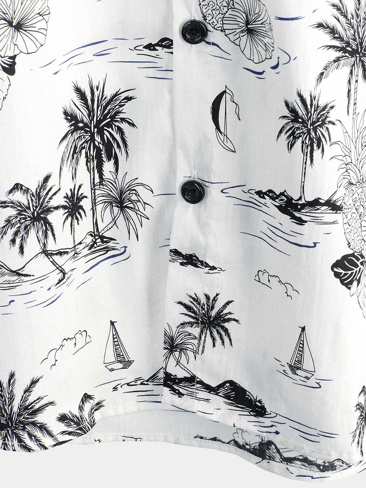 Men's Tropical Pineapple Palm Tree Print Aloha Short Sleeve White Hawaiian Shirt