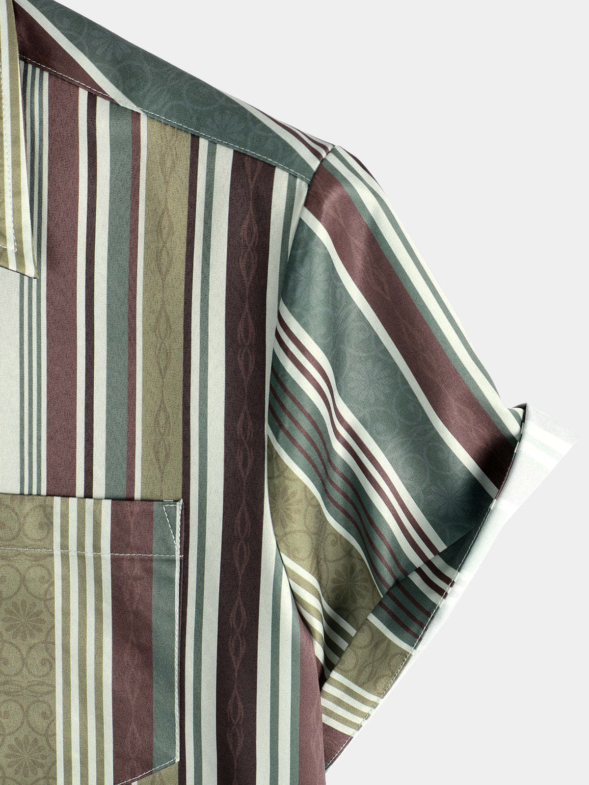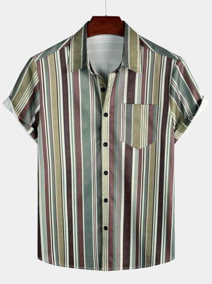 Men's Vintage Green And Brown Vertical Striped Button Up Pocket Short Sleeve Shirt