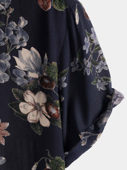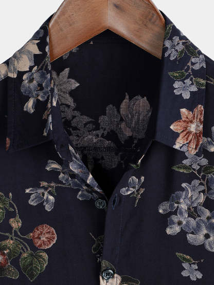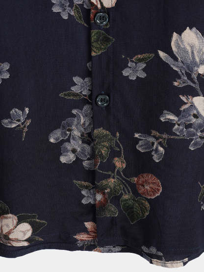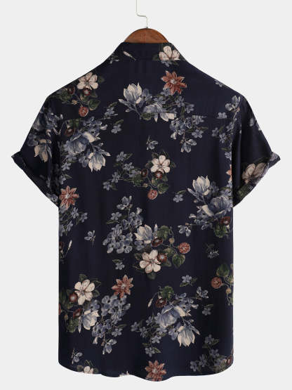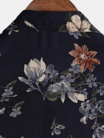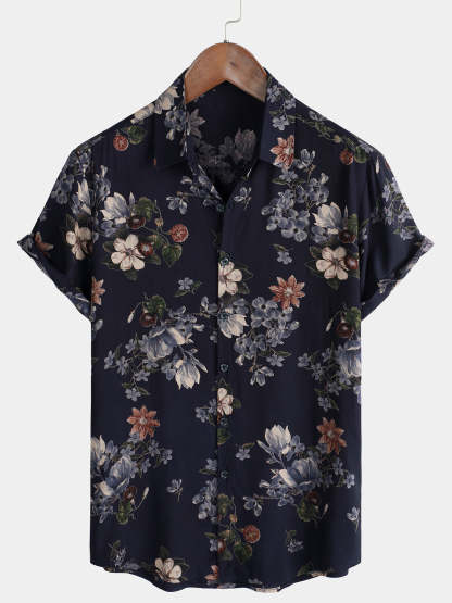 Men's Vintage Navy Blue Holiday Summer Floral Beach Rayon Short Sleeve Shirt