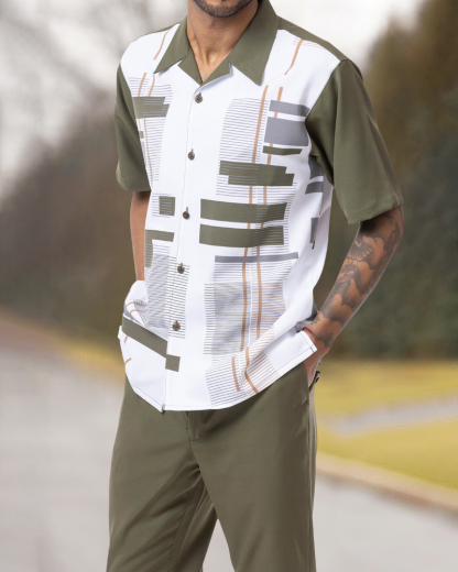 Olive Geometric Print Walking Suit 2 Piece Short Sleeve Set