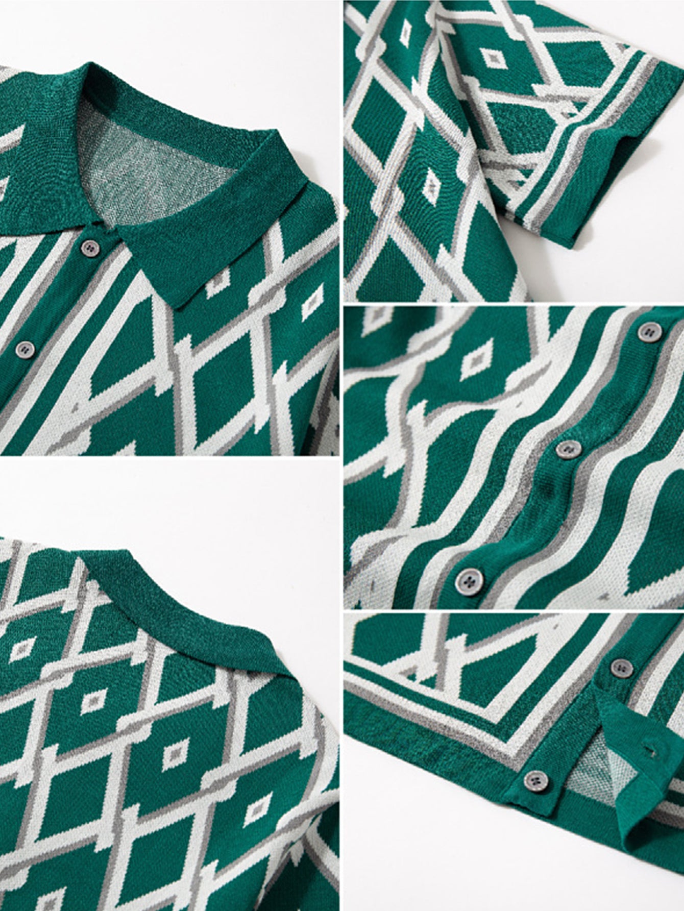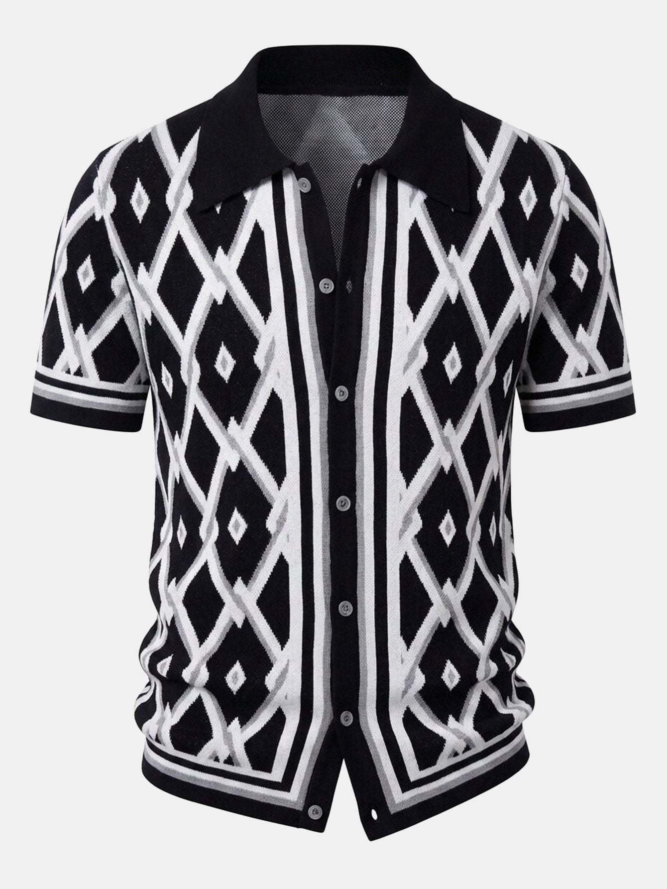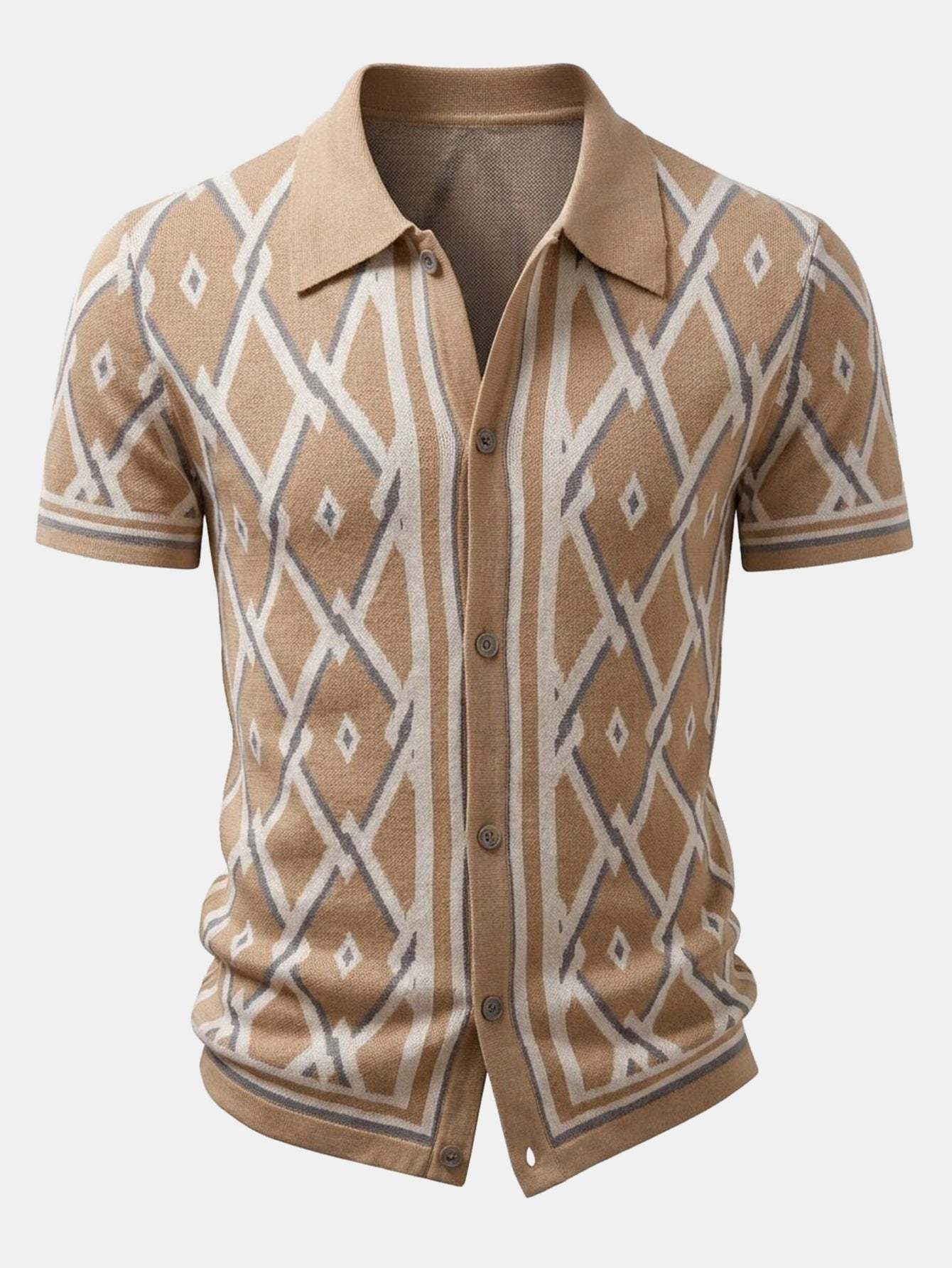 Featuring a sophisticated diamond lattice design in earthy tones of beige, white, and gray, this button-up shirt offers a comfortable fit with a soft, breathable knit texture. The classic polo collar adds structure, making it perfect for both casual outings and smart-casual occasions.
