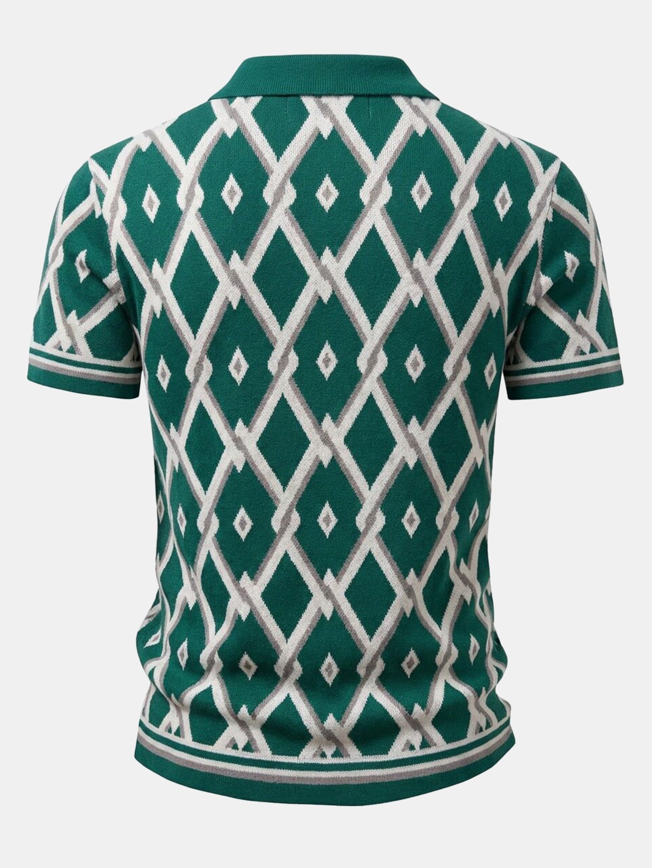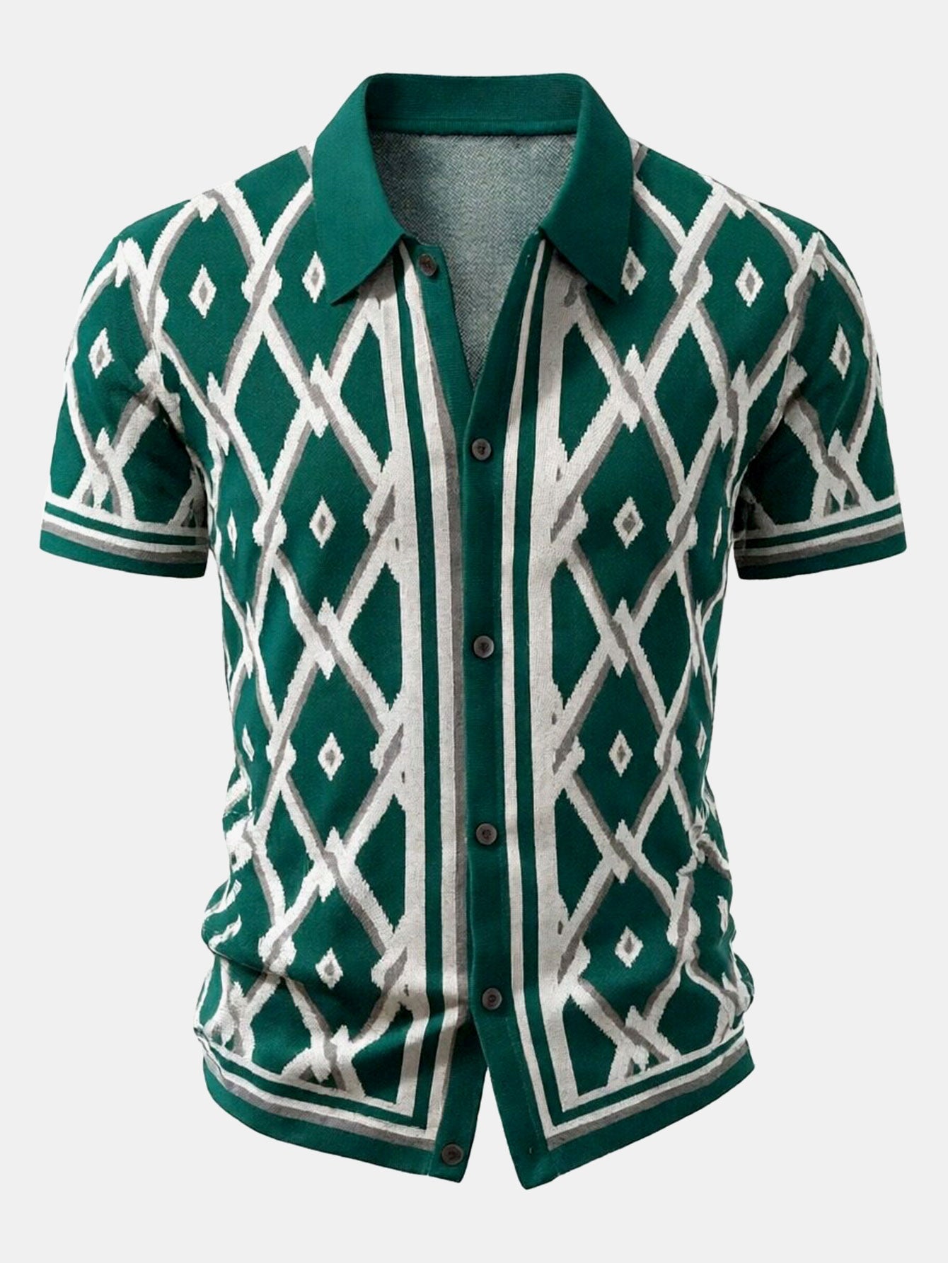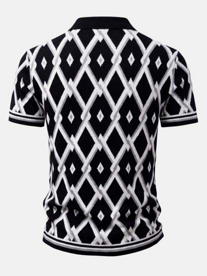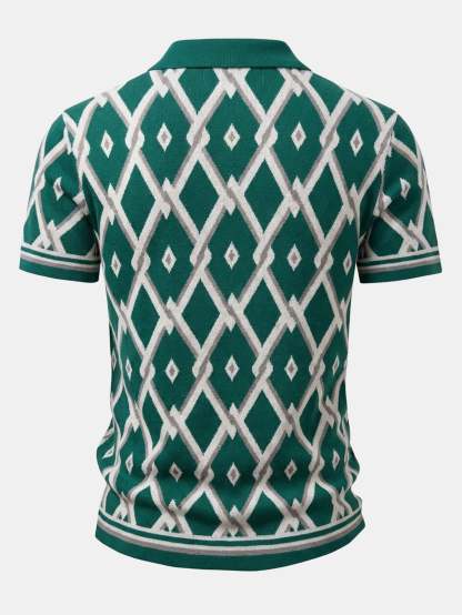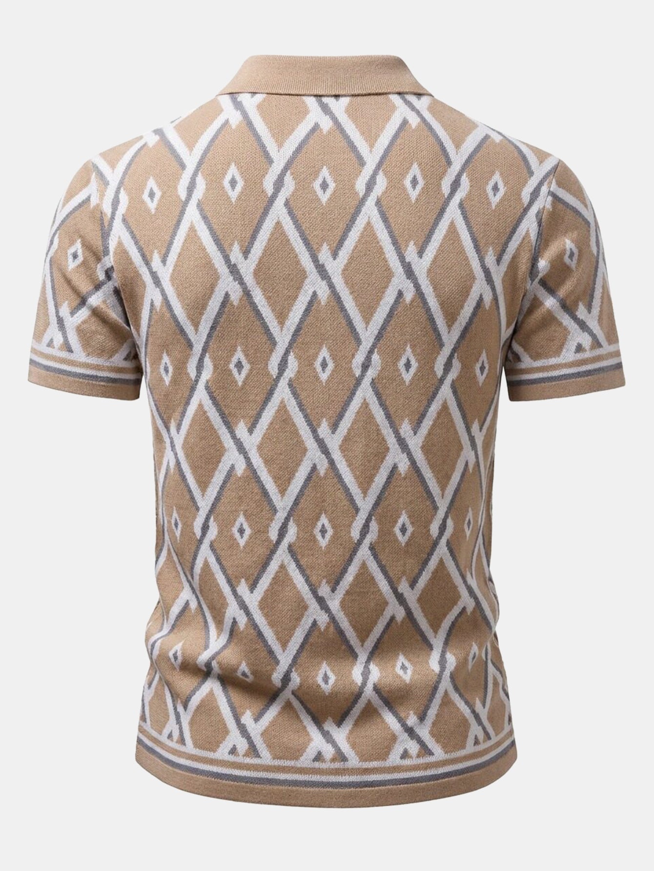 Featuring a sophisticated diamond lattice design in earthy tones of beige, white, and gray, this button-up shirt offers a comfortable fit with a soft, breathable knit texture. The classic polo collar adds structure, making it perfect for both casual outings and smart-casual occasions.