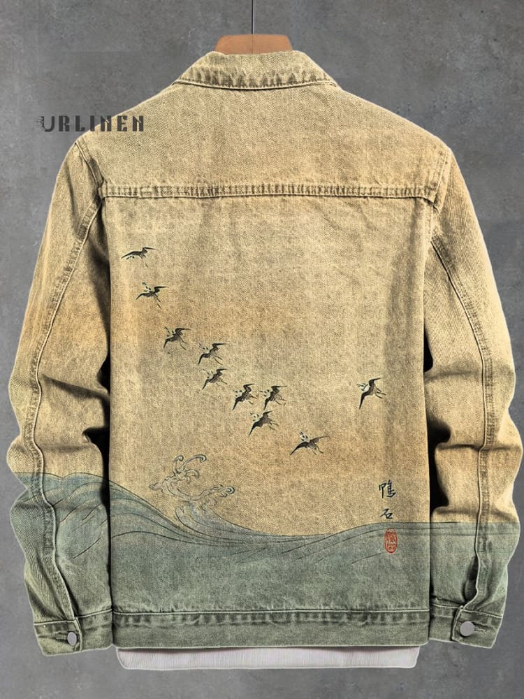 Retro Waves Seabirds Japanese Art Graphic Vintage Print Casual Denim Jacket