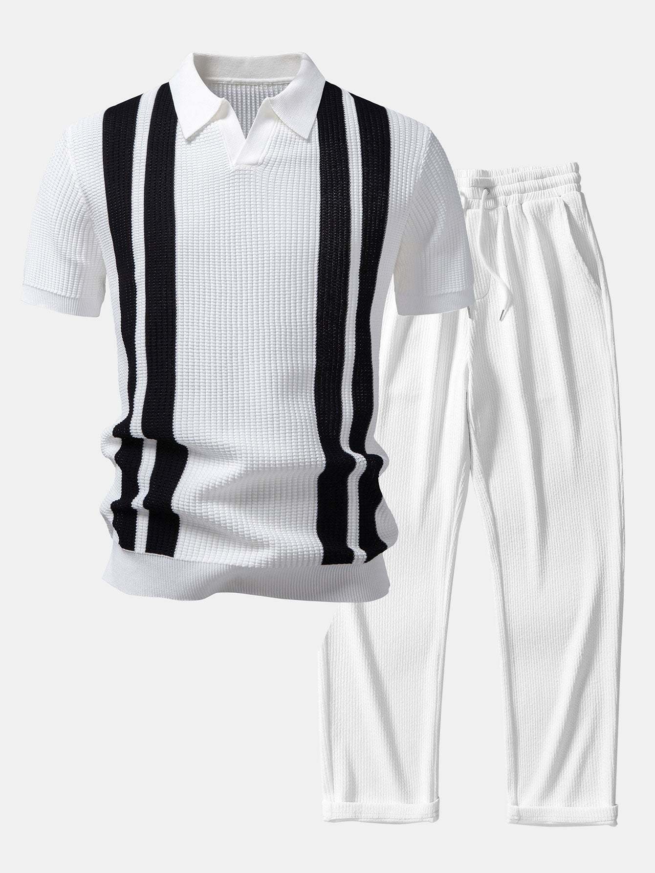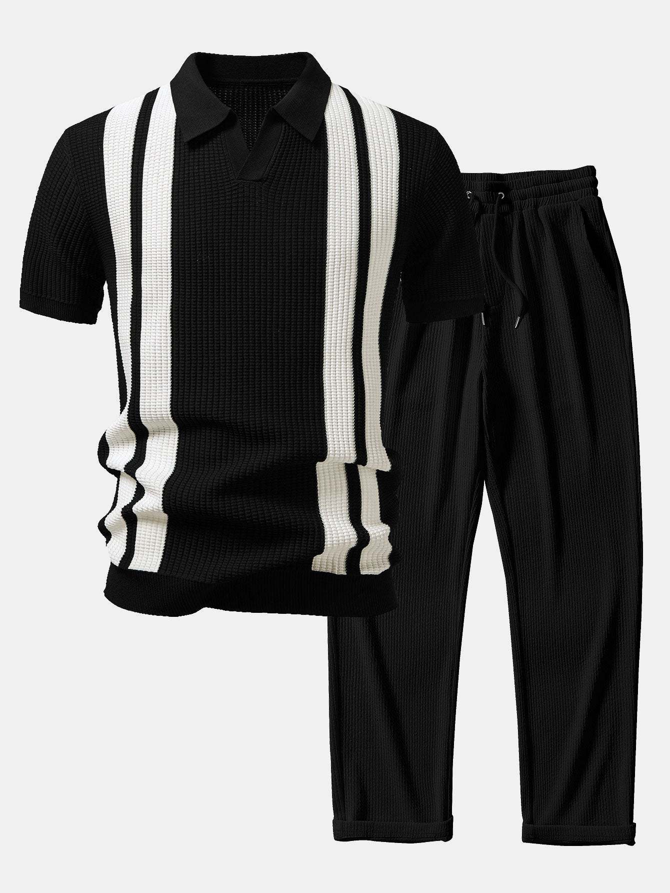 Refresh your everyday style with this stripe johnny collar knit polo & straight leg ribbed pants set, designed for comfort with a refined, modern edge. Crafted from soft, breathable knit fabrics, this coordinated outfit offers effortless wearability and a polished look.