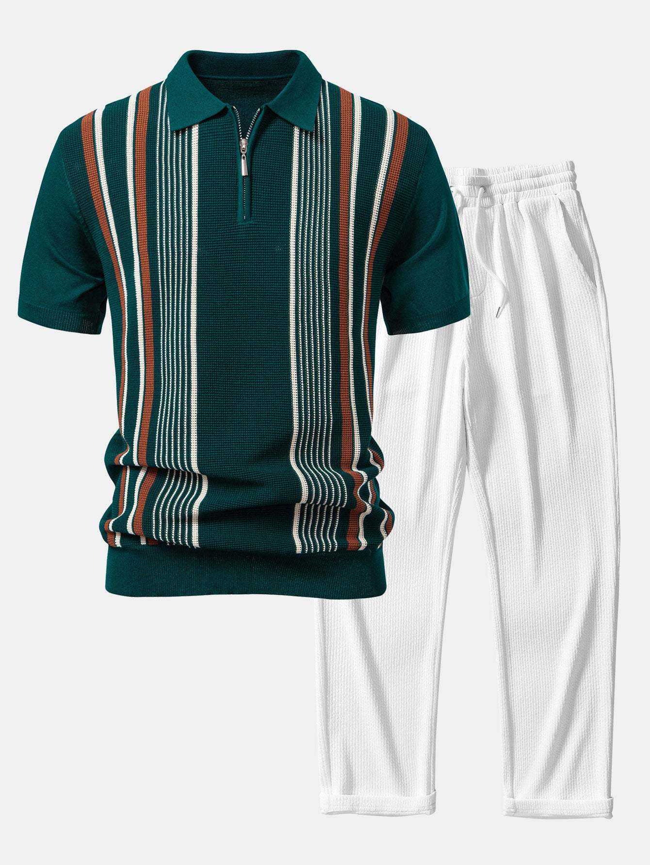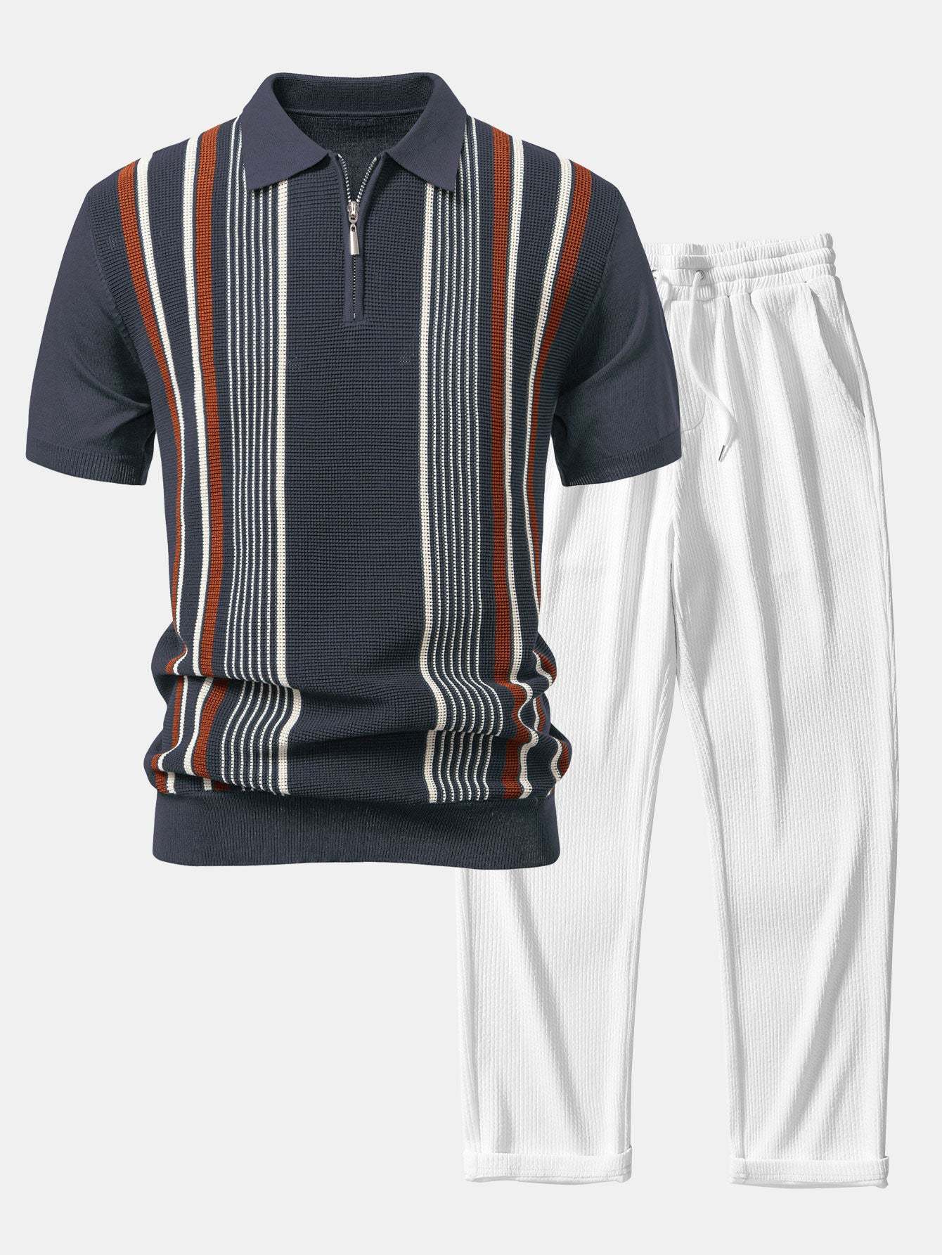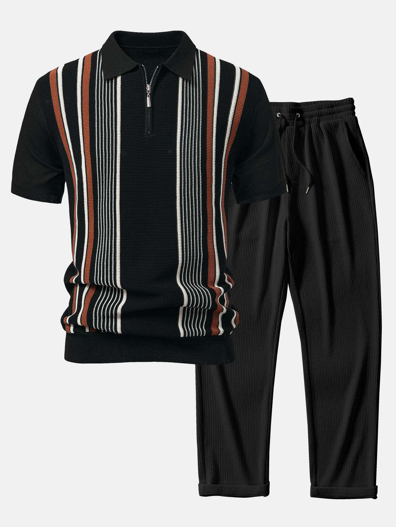 The top features a sporty zip-up collar and chic contrast stripes for a modern twist on the classic polo look. Paired with high-comfort ribbed knit pants that offer a relaxed, straight-leg fit, this set blends casual ease with contemporary flair. Perfect for lounging, weekend outings, or casual gatherings.