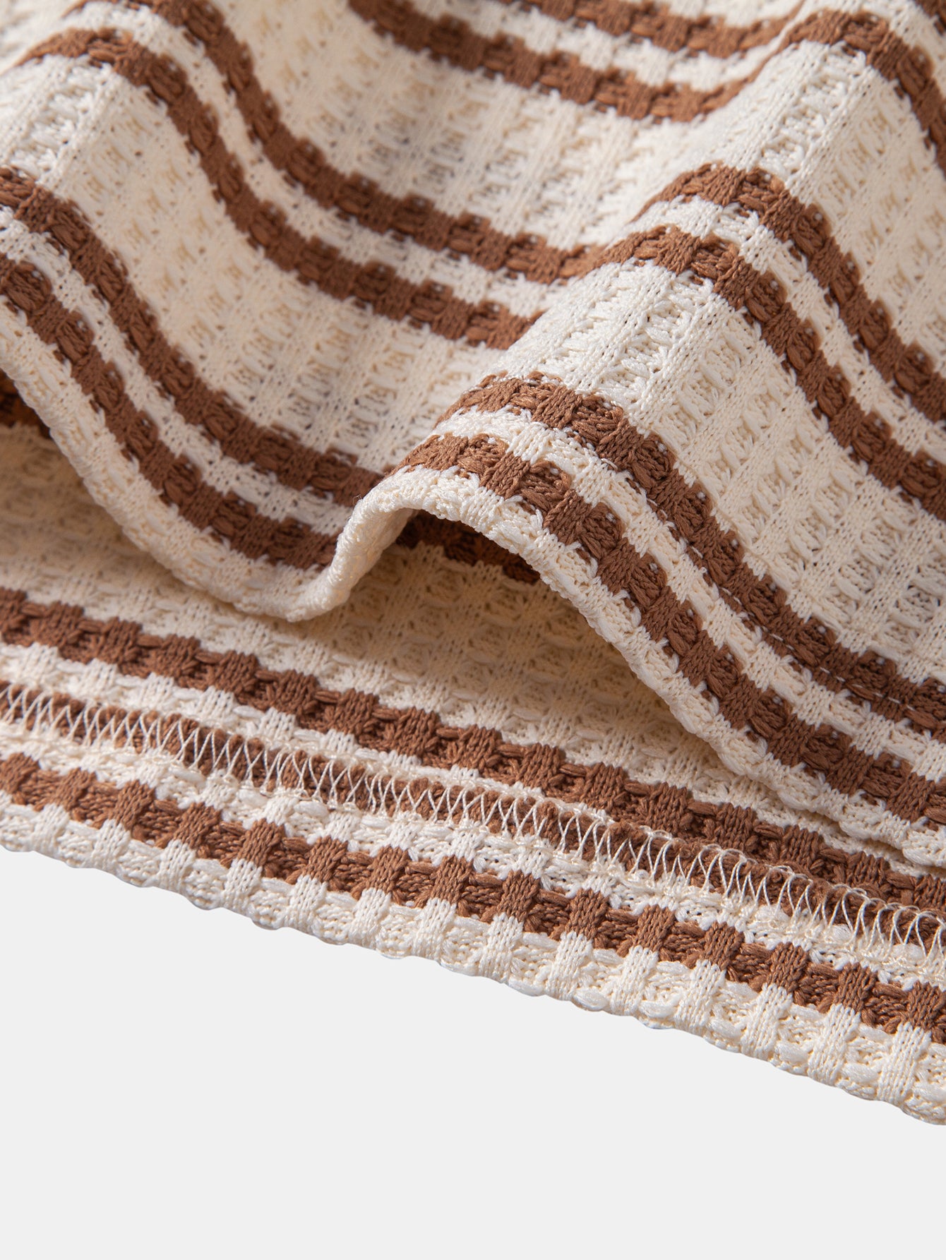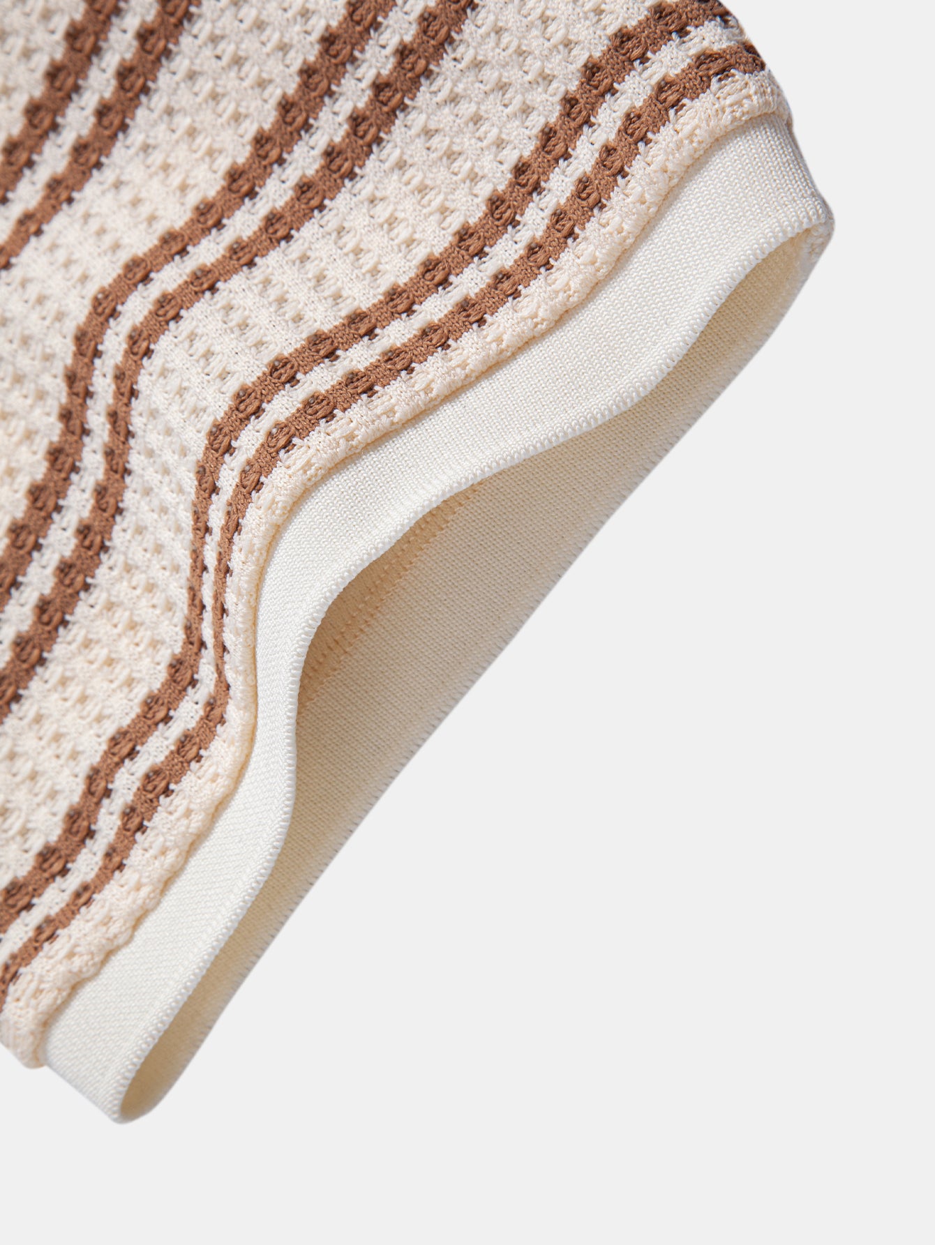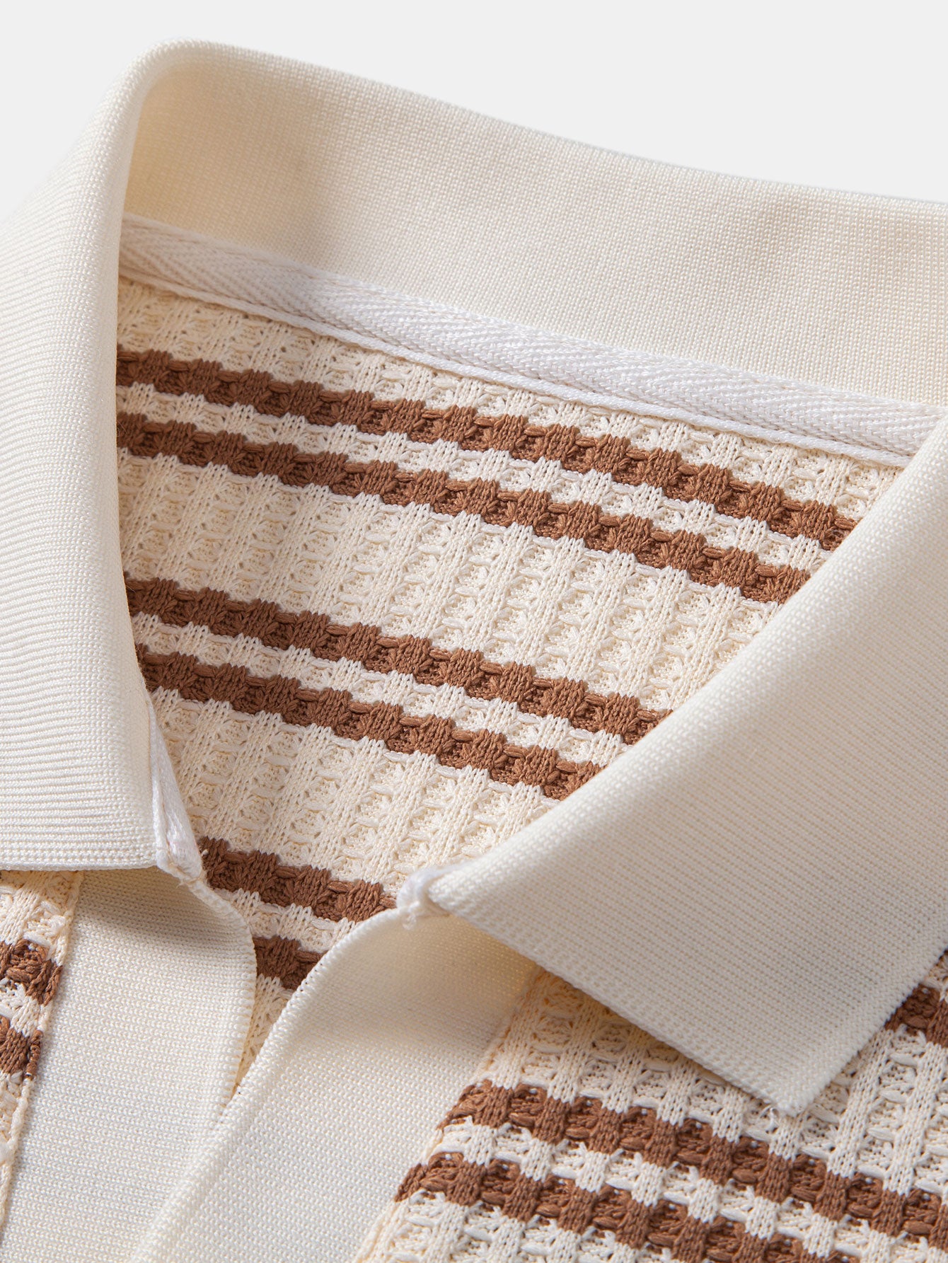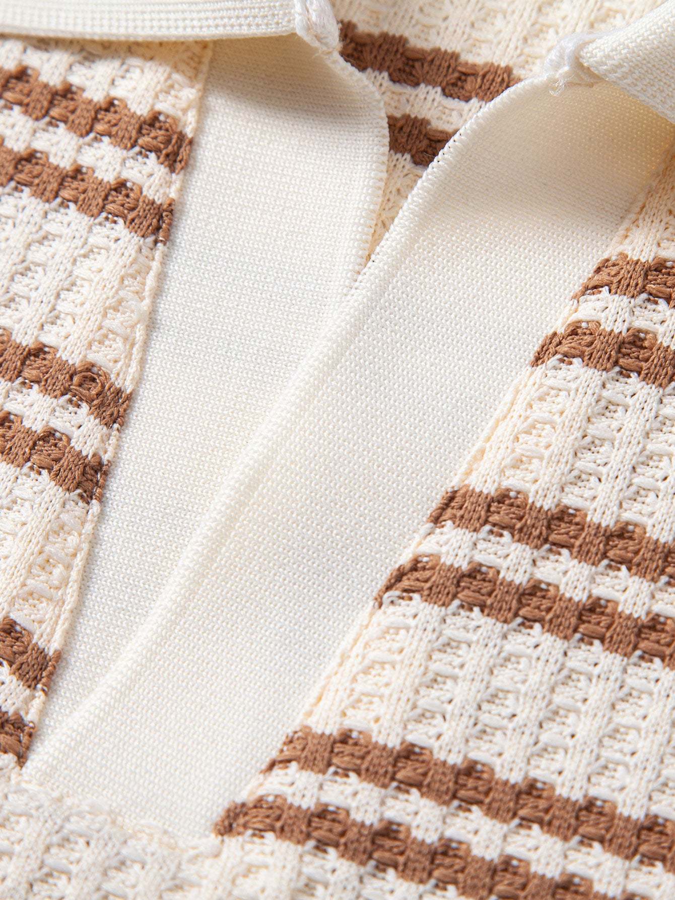This johnny collar polo features a textured waffle-knit fabric in an off-white base color with warm brown stripes, creating a relaxed, vintage summer vibe. Combining a sharp silhouette with a casual feel, it's perfect for both daily commutes and weekend getaways, allowing you to easily create a simple yet sophisticated look. The fabric has a slight stretch, conforming to the body without feeling restrictive, making it suitable for a variety of occasions.