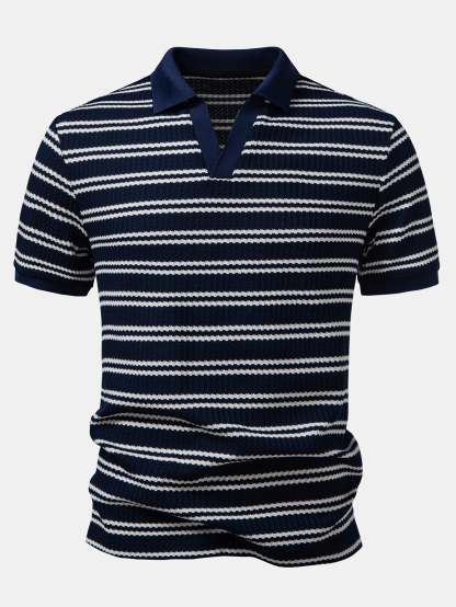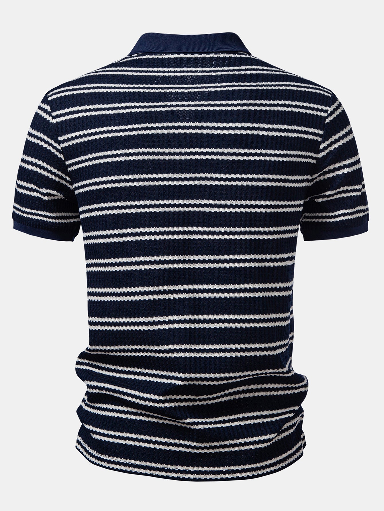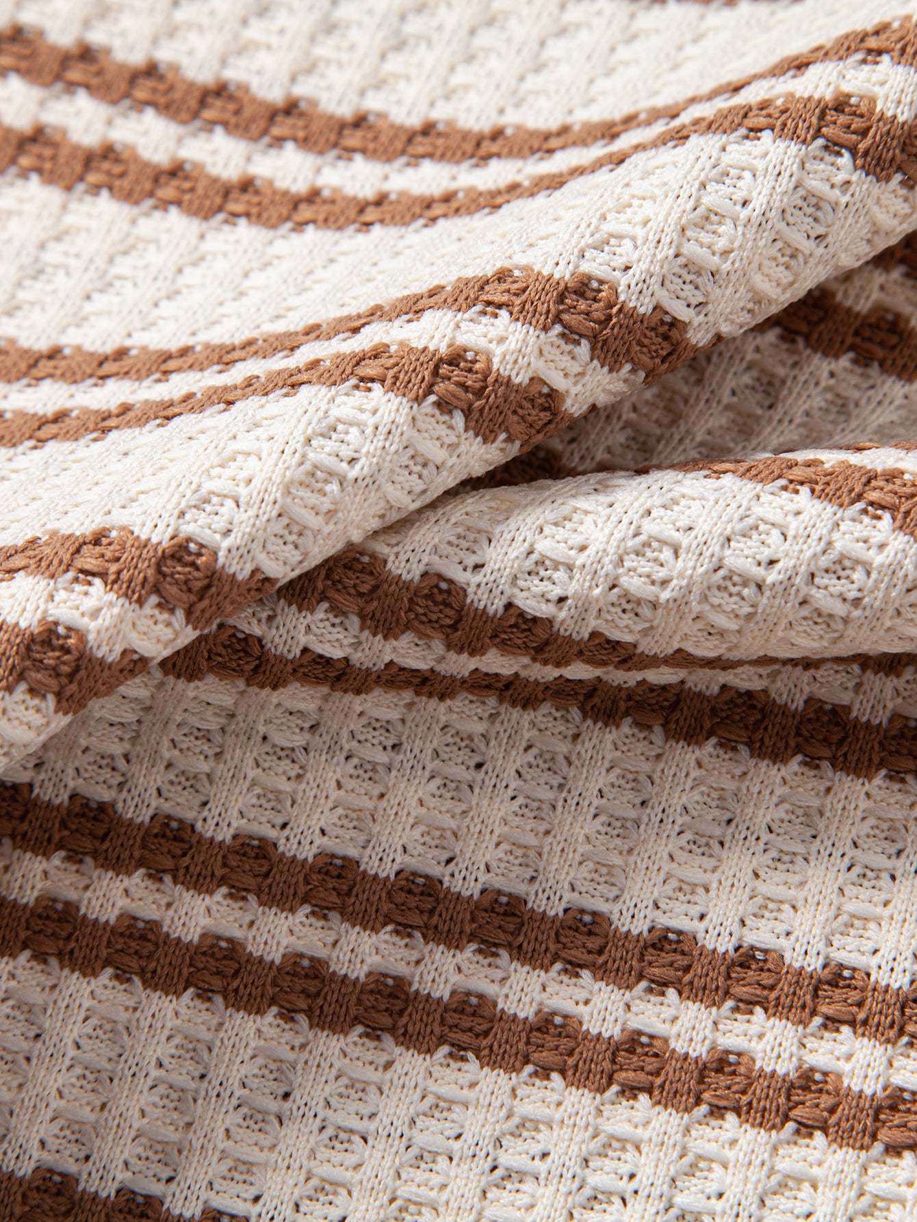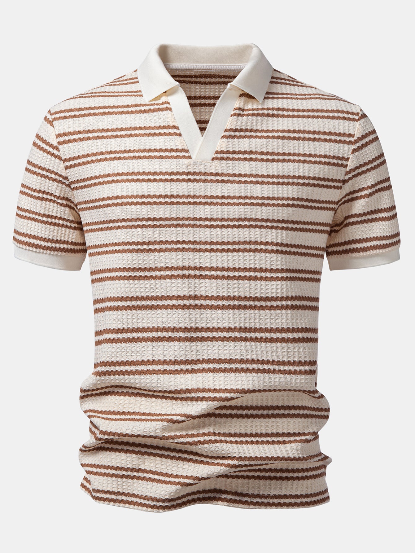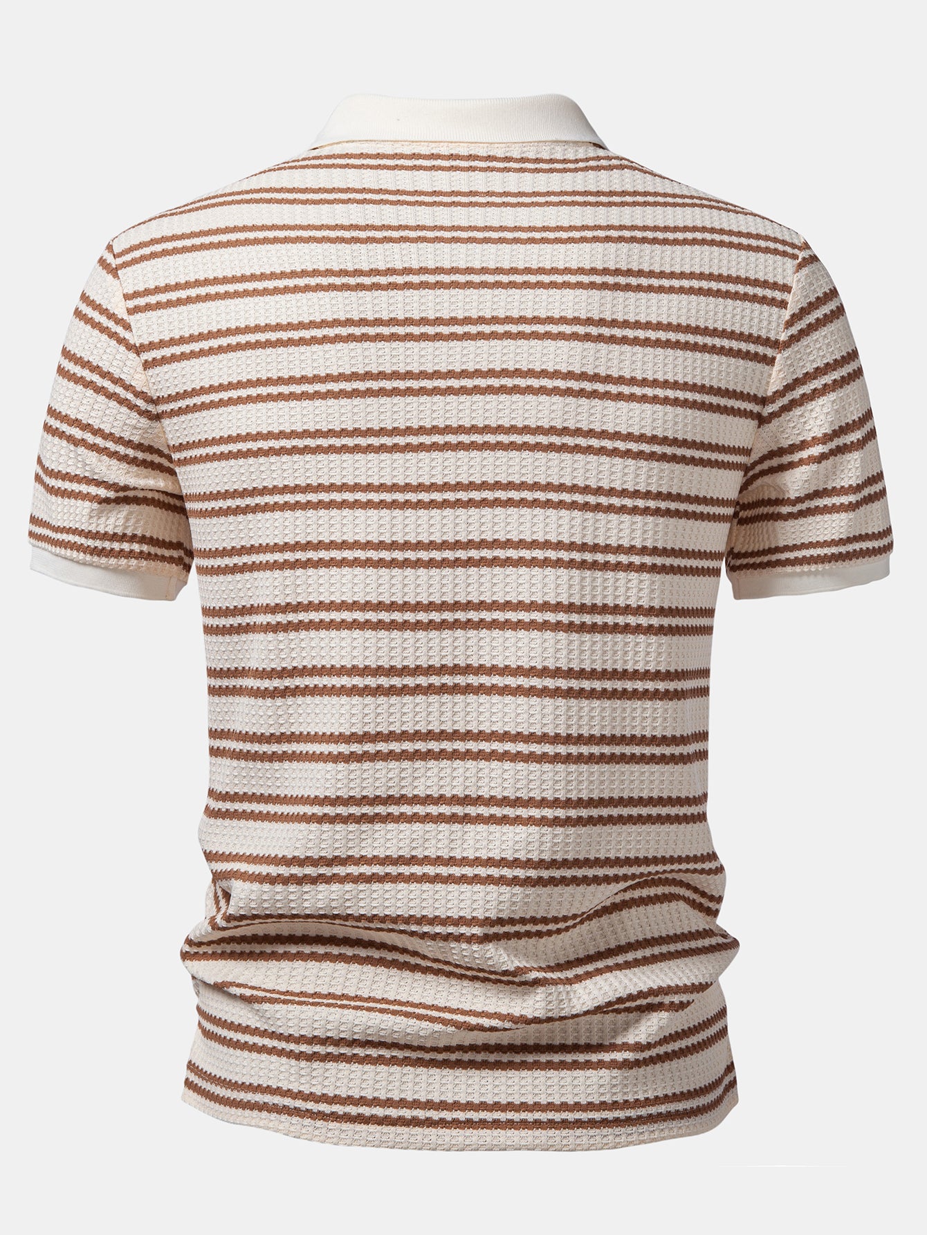 This johnny collar polo features a textured waffle-knit fabric in an off-white base color with warm brown stripes, creating a relaxed, vintage summer vibe. Combining a sharp silhouette with a casual feel, it's perfect for both daily commutes and weekend getaways, allowing you to easily create a simple yet sophisticated look. The fabric has a slight stretch, conforming to the body without feeling restrictive, making it suitable for a variety of occasions.
