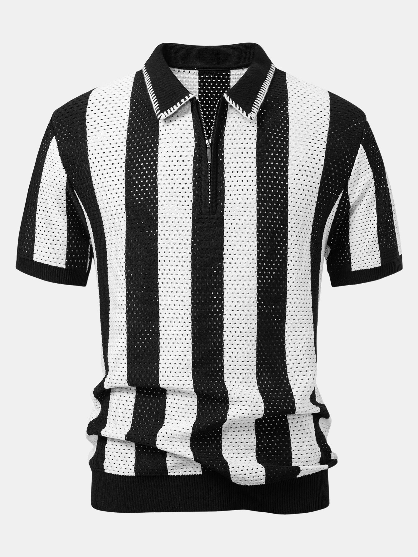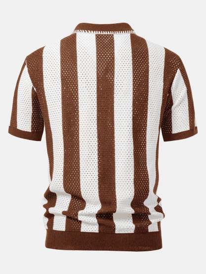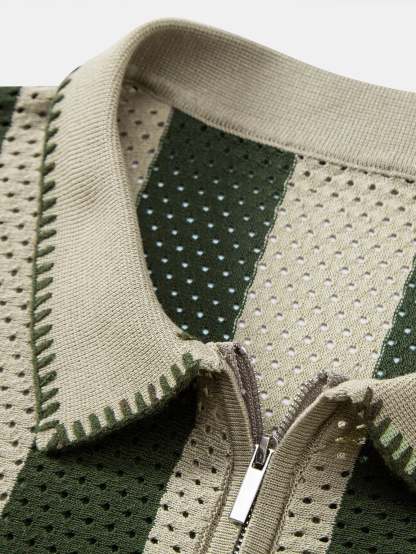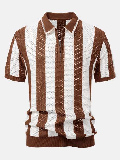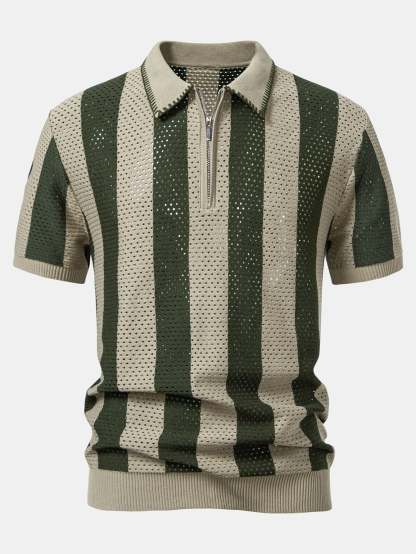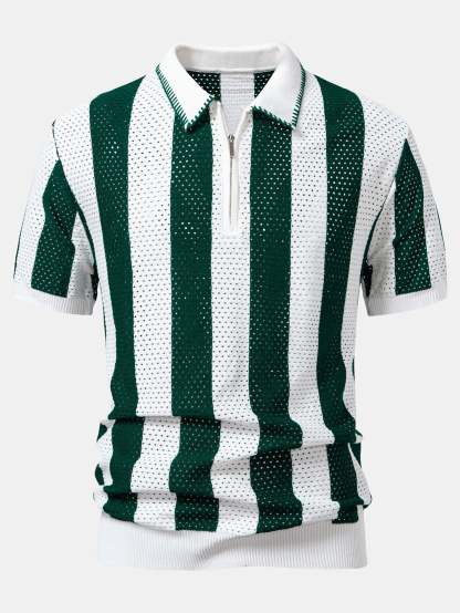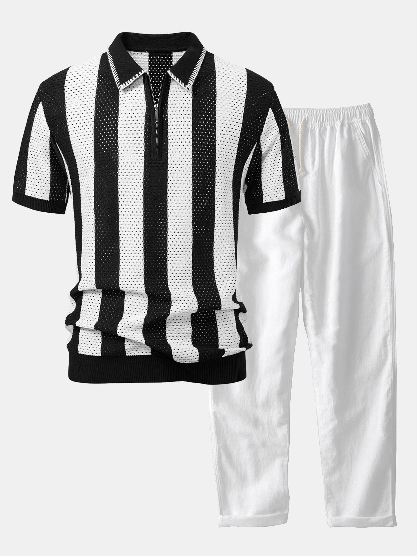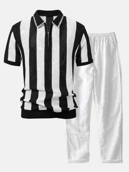 Upgrade your summer wardrobe with this striped eyelet knit zip up polo shirt & straight leg linen pants set. The polo shirt features breathable eyelet knit stripes and a sleek zipper collar, while the linen pants offer a relaxed fit ideal for warm climates. Whether you're heading to the beach or a weekend outing, this lightweight set keeps you cool and stylish.