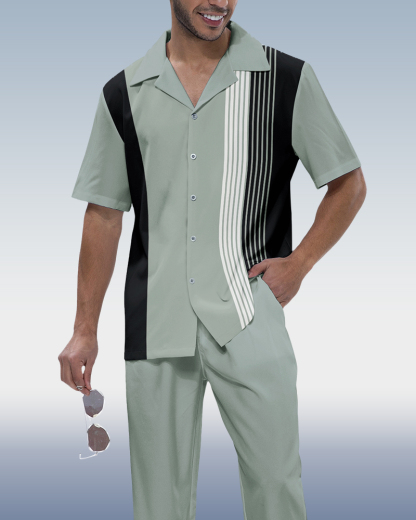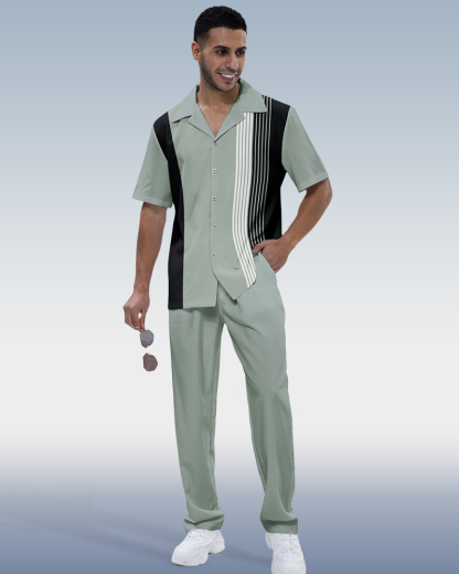 Men's Casual Green Color Matching Geometric Printed Short Sleeved Polo Shirt & Trousers Two-Piece Set