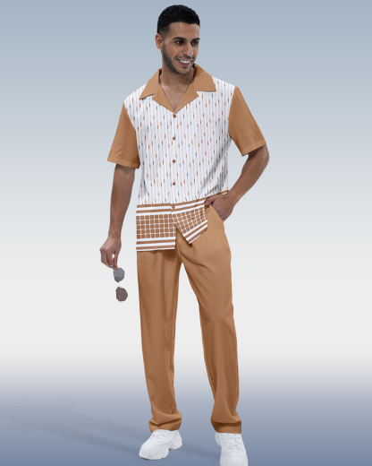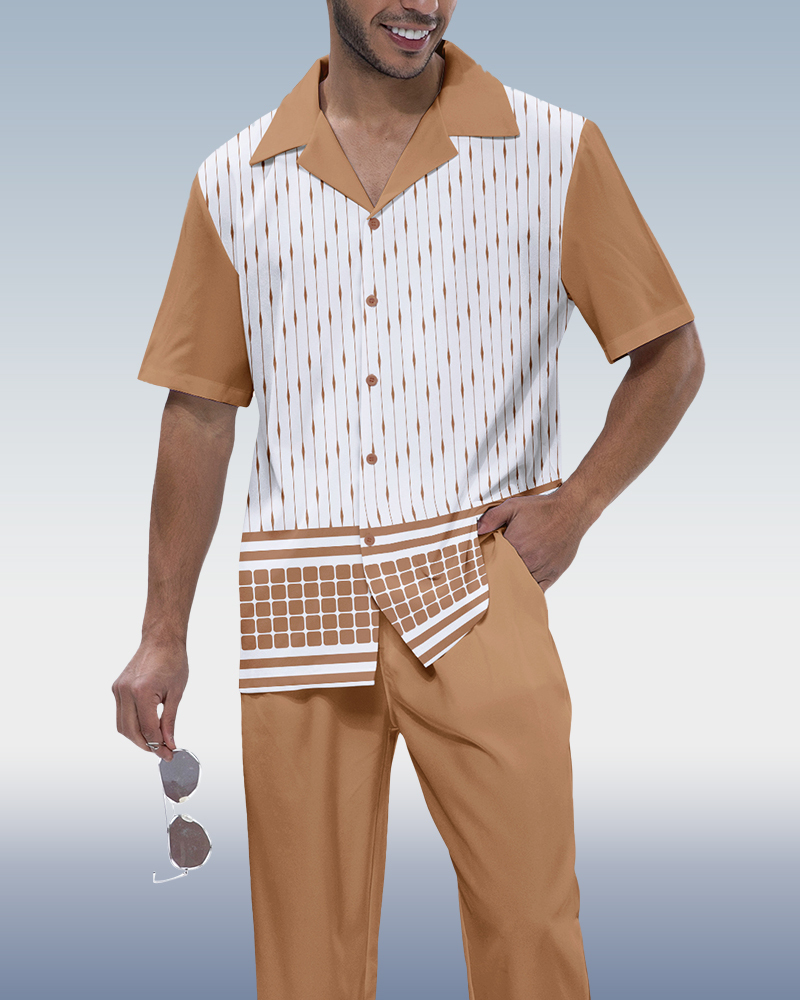 Men's Casual Tan & Black Color Matching VIntage Patchwork Printed Short Sleeved Polo Shirt & Trousers Two-Piece Set