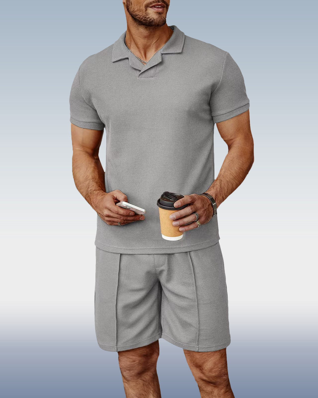 Men's Gray Knit V-Neck Polo Shirt