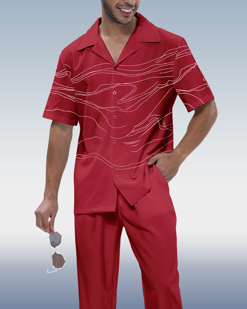 Men's Casual Color Matching Printed Polo-Collar Short Sleeved Trousers Two-Piece Set 15