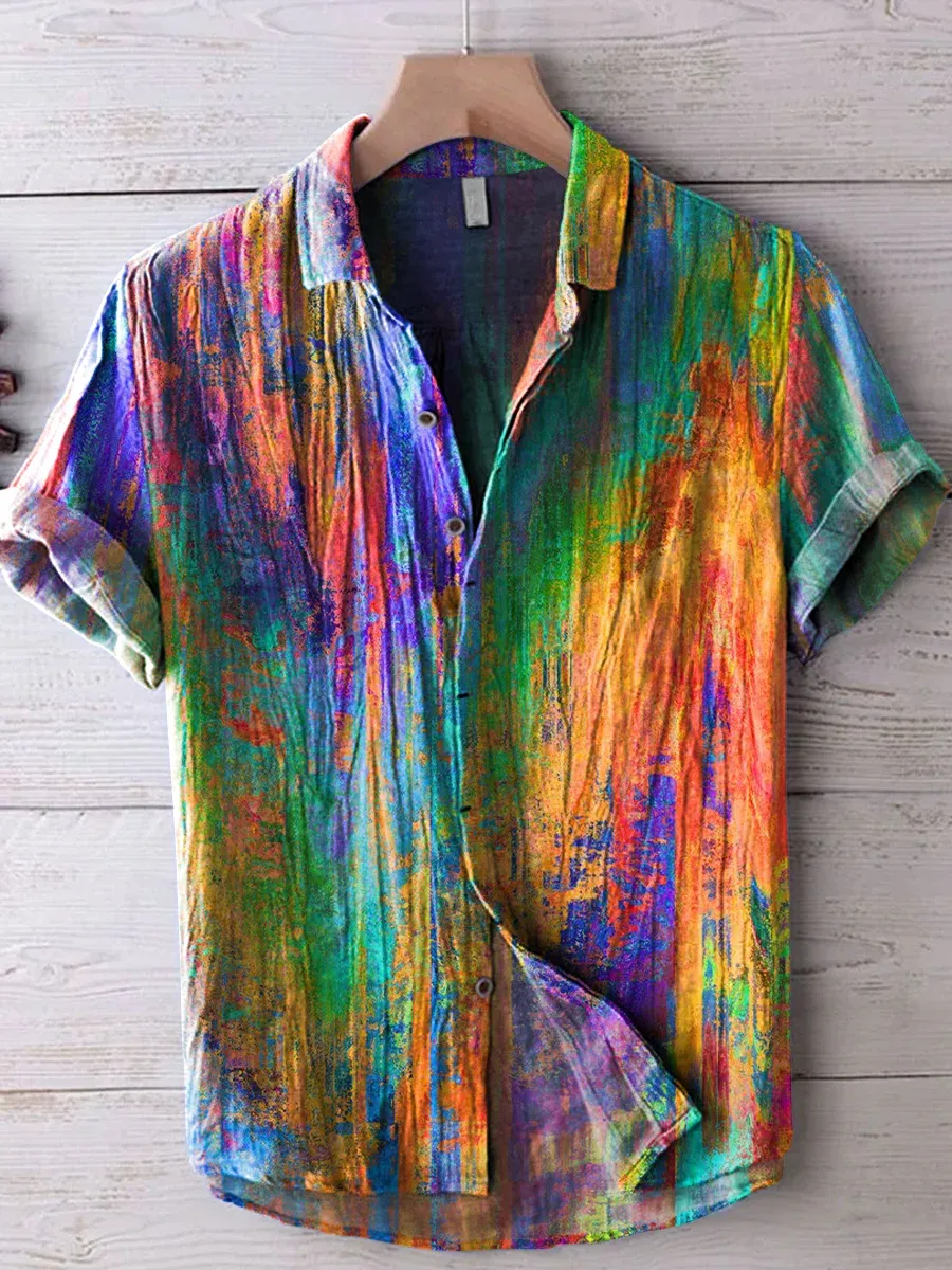 Vintage Rainbow Mottled Art Cat Print Casual 100% Cotton Shirt