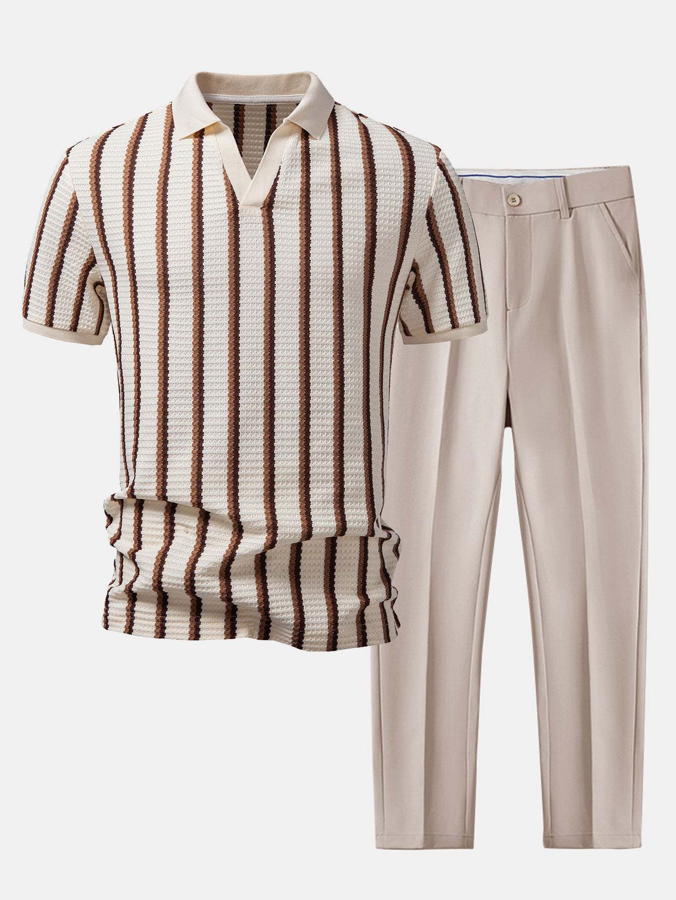 Upgrade your smart-casual wardrobe with this waffle stripe johnny collar polo & slim fit tapered trousers set, designed to balance texture, comfort, and modern style. Crafted from soft, breathable waffle fabric, this two-piece outfit offers a refined look with an easy, relaxed feel.