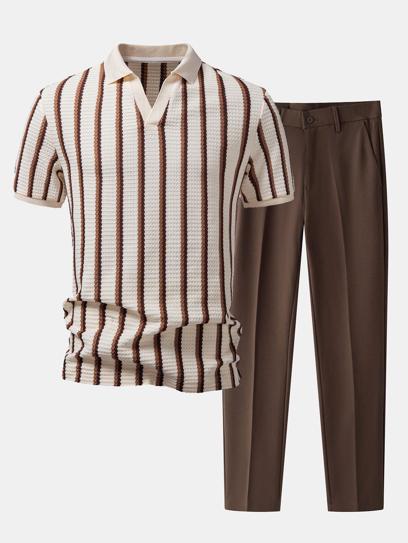 Upgrade your smart-casual wardrobe with this waffle stripe johnny collar polo & slim fit tapered trousers set, designed to balance texture, comfort, and modern style. Crafted from soft, breathable waffle fabric, this two-piece outfit offers a refined look with an easy, relaxed feel.