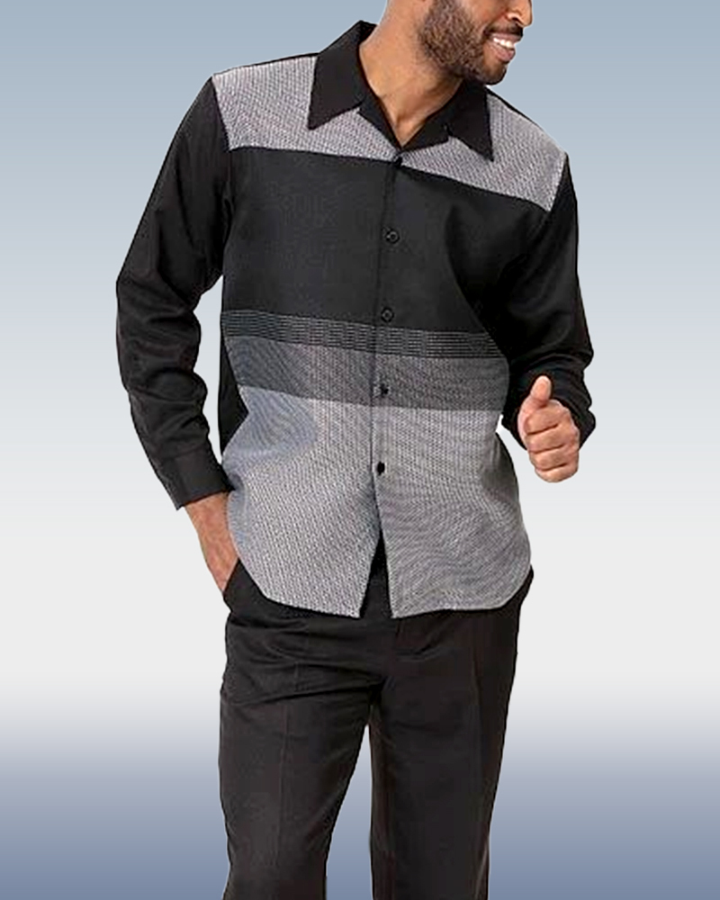 Men's Casual Black & White Color Matching Gadient Printed Short Sleeved Polo Shirt & Trousers Two-Piece Set